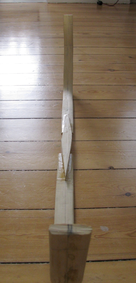 Ich bin derweil immer noch mit dem Holzkern beschäftigt. Knifflig, knifflig. Heute habe ich am fünfteiligen Holzkern weitergearbeitet und ein Griffstück 36cm lang aus Goldregen gesägt. Goldregen ist schön schwer und ausserdem hervorragendes Bogenholz. Dann habe ich Spleisse in das Griffstück und in beide Wurfarme gesägt und schon einmal probehalber die Teile zusammengesteckt.
