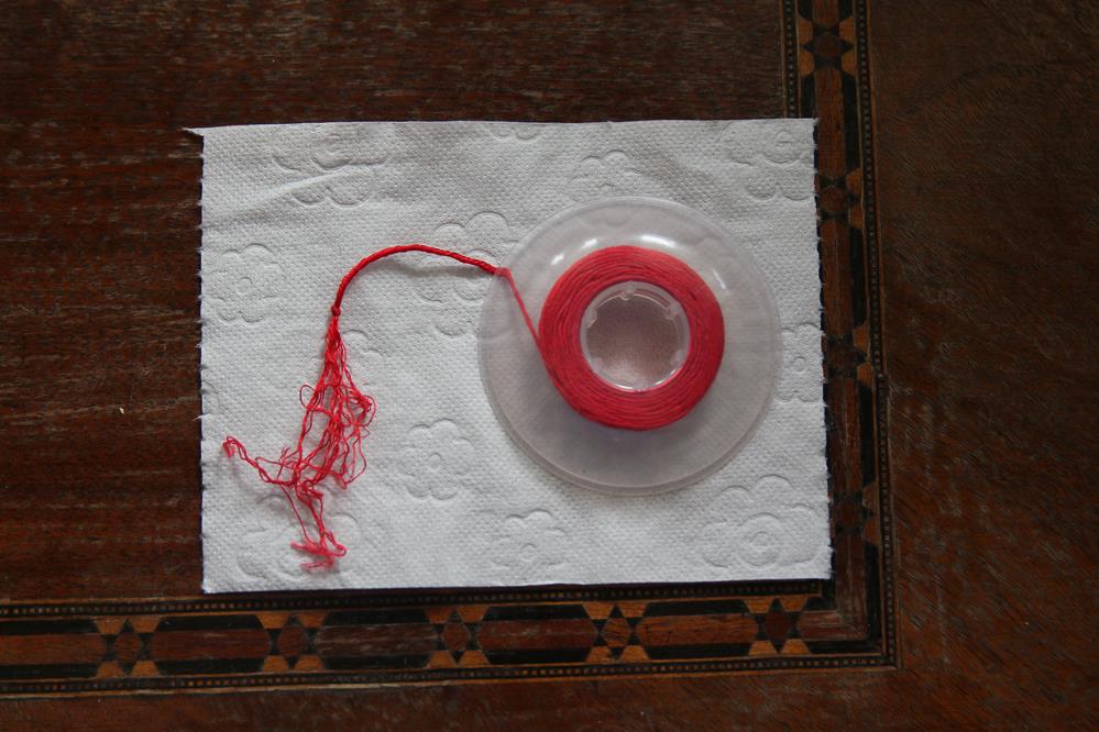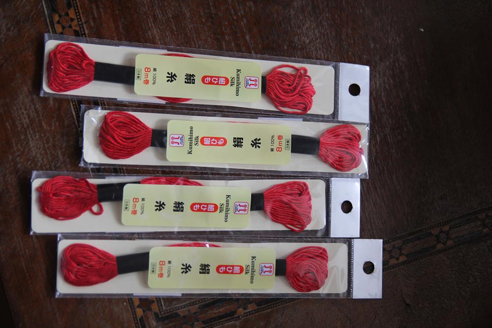 Die Farbaufträge am Korpus brauchen seine Zeit. In der Zwischenzeit wird die Kordel geflochten nach Kumihimo Art mit Seidenfäden.Gebraucht werden dafür 4 Seidenfäden von 0,8mm und 6m länge .Dieser einzelne Faden von 0,8mm besteht aus 40 einzelnen Seidenfäden. Die 4 Fäden auf der Flechtscheibe anbringen und mit der einfachsten Flechtung beginnen. Die Kordel die daraus ensteht muss ca. 1,5 m sein.