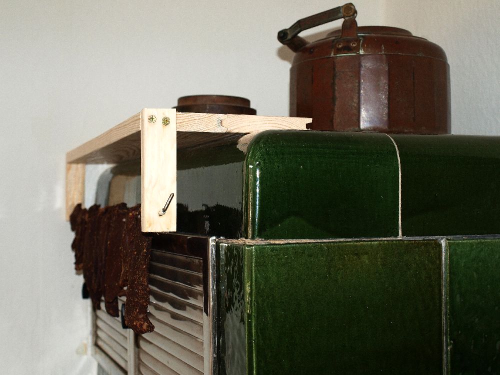 Bild 2: Einfache Aufhängekonstruktion zum Festklemmen am Fensterbrett. Die Fleischstreifen wurden über eine ummantelte Stahlstange ( 4mm) geschoben.