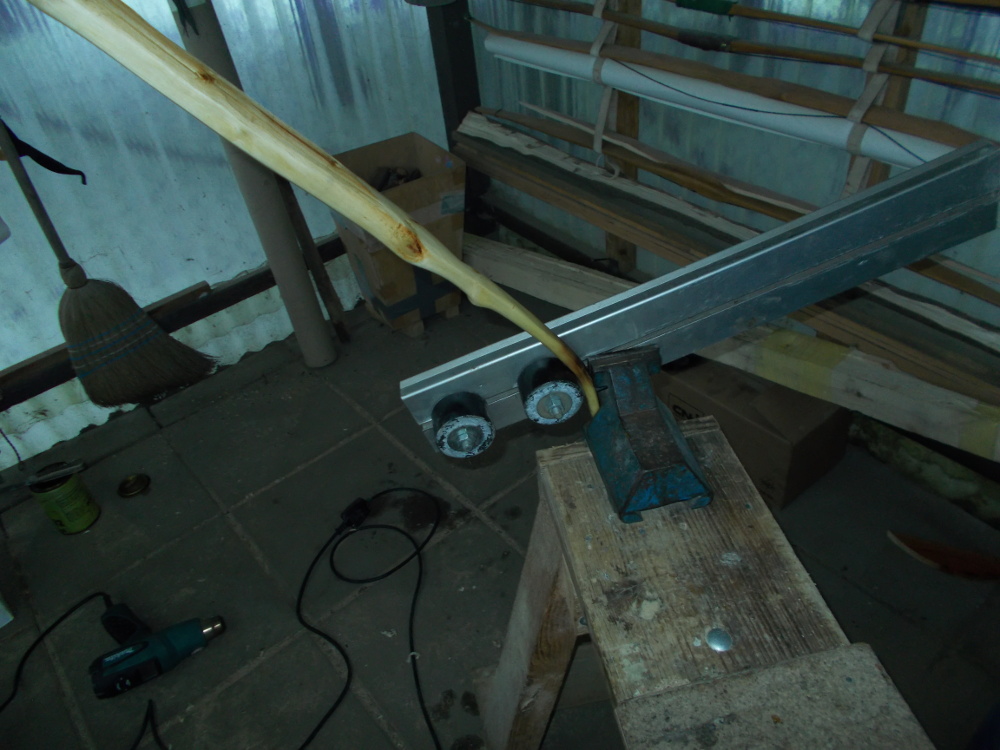 Heute Overlays aus Horn aufgeklebt und so ziemlich die Form ausgearbeitet, ein wenig biegt er schon im Bodentiller.