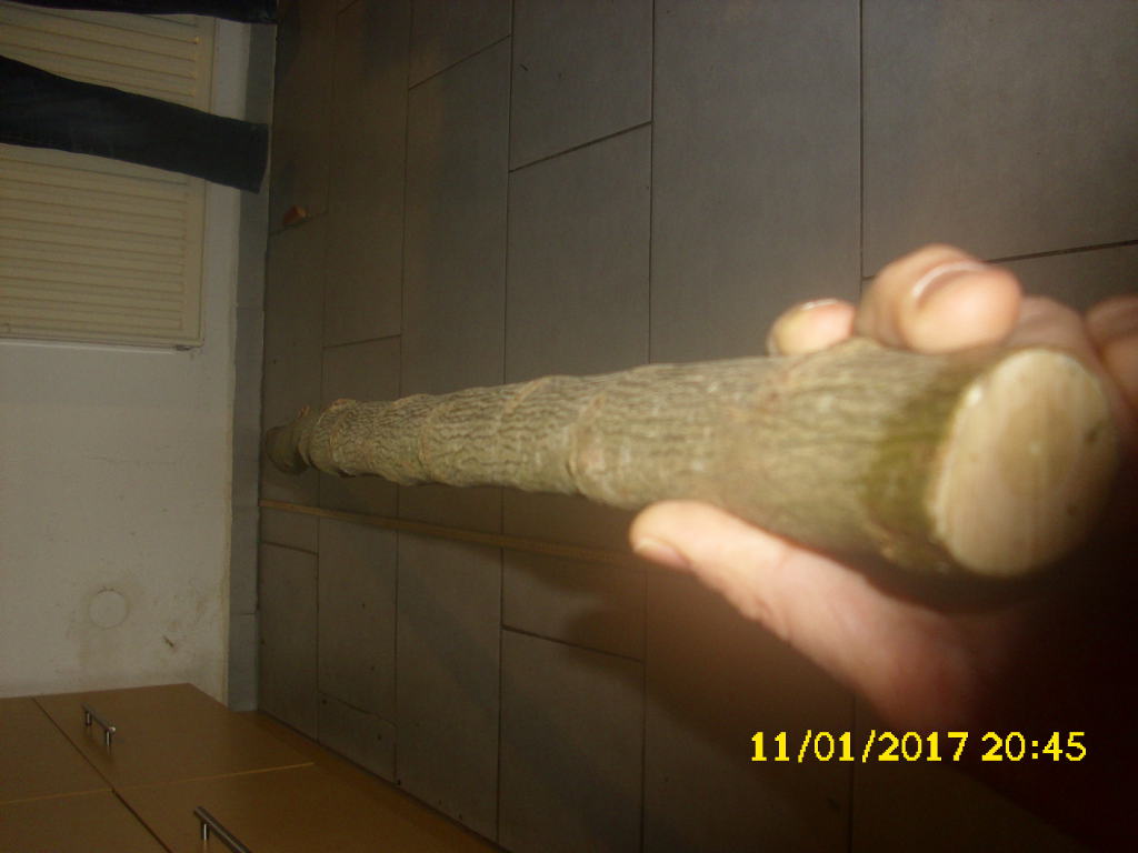 vom Hartriegel heute die Rinde abgepellt, ging eigentlich ganz gut. Erstaunlich,wieviel so ein bißchen Rinde von so nem dünnen Stengel wiegen kann: fast 60g.Jetzt wiegt er noch 646g, da scheint noch gut Wasser drin zu sein.Der Markkanal ist immer noch teils innenliegend, aber anders gehts wohl nicht, wenn da noch was passables bei rauskommen soll, gekürzt wird er auch noch, sonst wir er zu schlabberig. Dicke in der Mitte liegt jetzt noch knapp über 2cm, das geht grad noch.