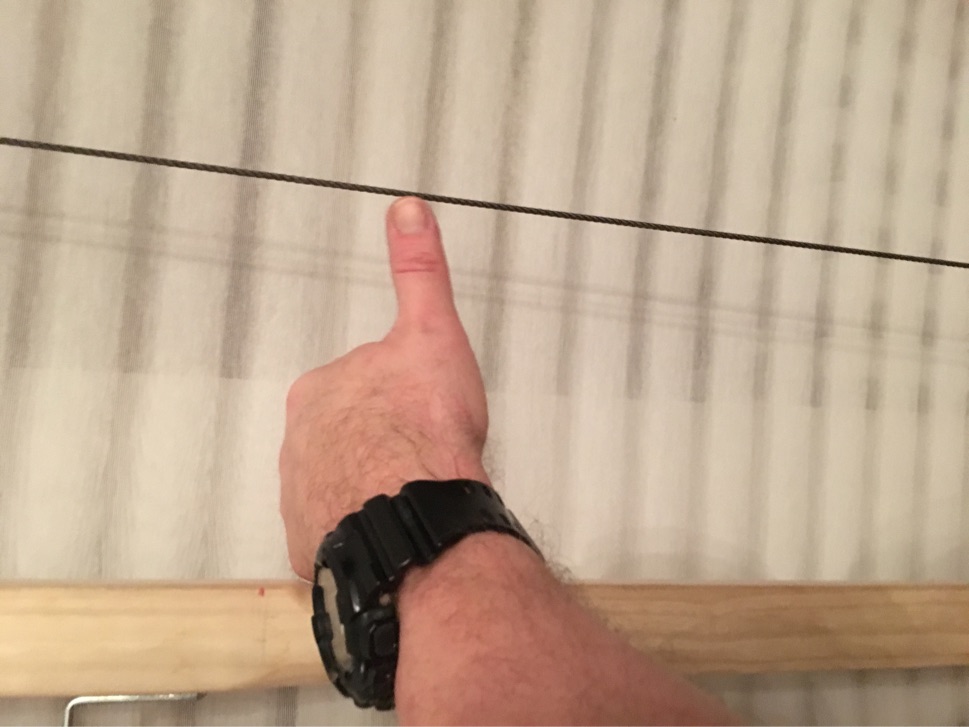 Die Gummizügel sind aus schwarzem Theraband geschnitten und mit Aluringen an den Enden versehen. Ein Paar davon gibt bei 30“Auszug ca. 10# Zuggewicht (lässt sich über die Länge der Sehne gut feintunen); ab 5 Stück pro Seite muss man lediglich einen größeren Karabiner einhängen.
