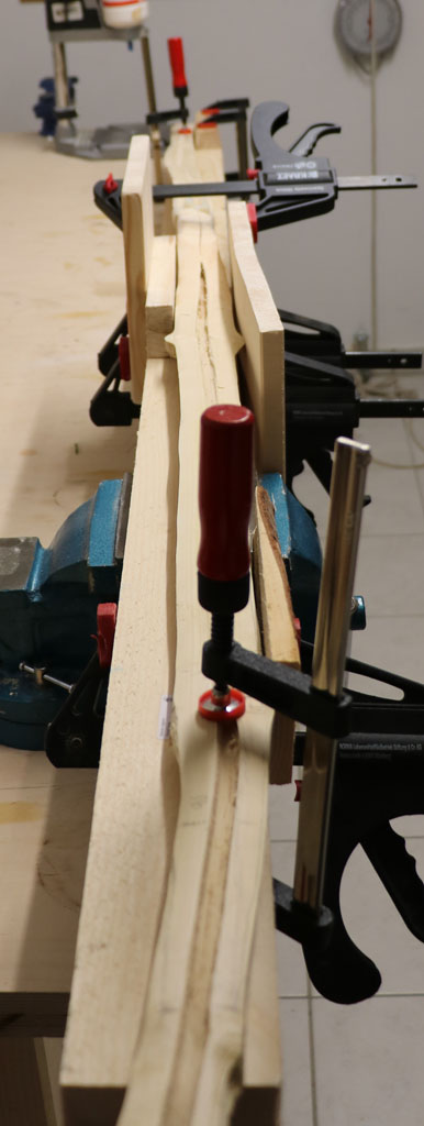 Hmm, den Riss im Rücken hast Du leider selbst verursacht. Du hast dem Griffbereich bauchseitig eine Lücke verschafft (was ja prinzipiell begrüssenswert ist), aber durch die Zwinge hast Du Spannung am Rücken aufgebaut (Lücke zusammen gepresst und somit Spannung auf der anderen Seite). Und zu allem Elend war da halt dieser kleine Astknubbel auf Rücken, von dem der Riss dann ausgegangen ist.