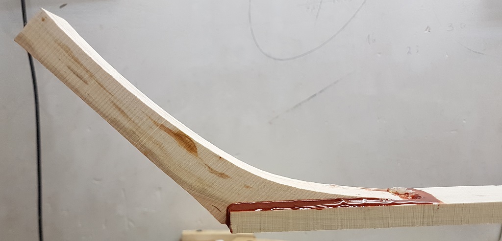 Gestern habe ich mit der Bandsäge vom Hasel das Rückenlaminat runter geschnitten - freihand ca. 8 mm dick. Dann mit dem Hobel getapert, ca. 3 mm - 7 mm.