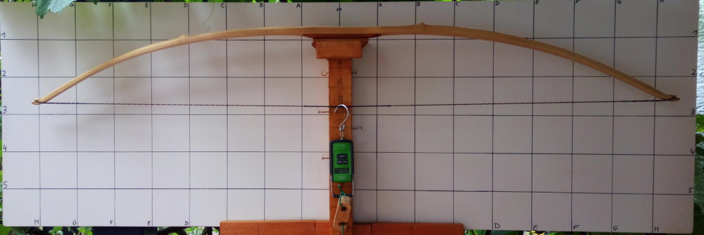 ok, nun weiß ich bis 80lbs ist es Deko, allerdings denke ich immer wieder beim Anblick der dünnen Holzstege, die da manchmal zwischen den Sehnenkerben verbleiben "das soll halten?!" von daher tendiere ich doch eher zum Sofakissen vor der Stoßstange. Inzwischen habe ich 200 Pfeile geschossen und der Bogen entwickelt leichtes Stringfollow (scheint bei Holler normal zu sein, bei 2 von 2 Stichproben) und ich dachte, unten biegt der sich mehr. Also habe ich ihn zur Kontrolle nochmal auf den Tillerbaum... und da sah ich, dass mein Rasterbrett seitlich verschoben ist. Ich habe den ganzen Bogen mit einem verschobenen Raster gebaut.