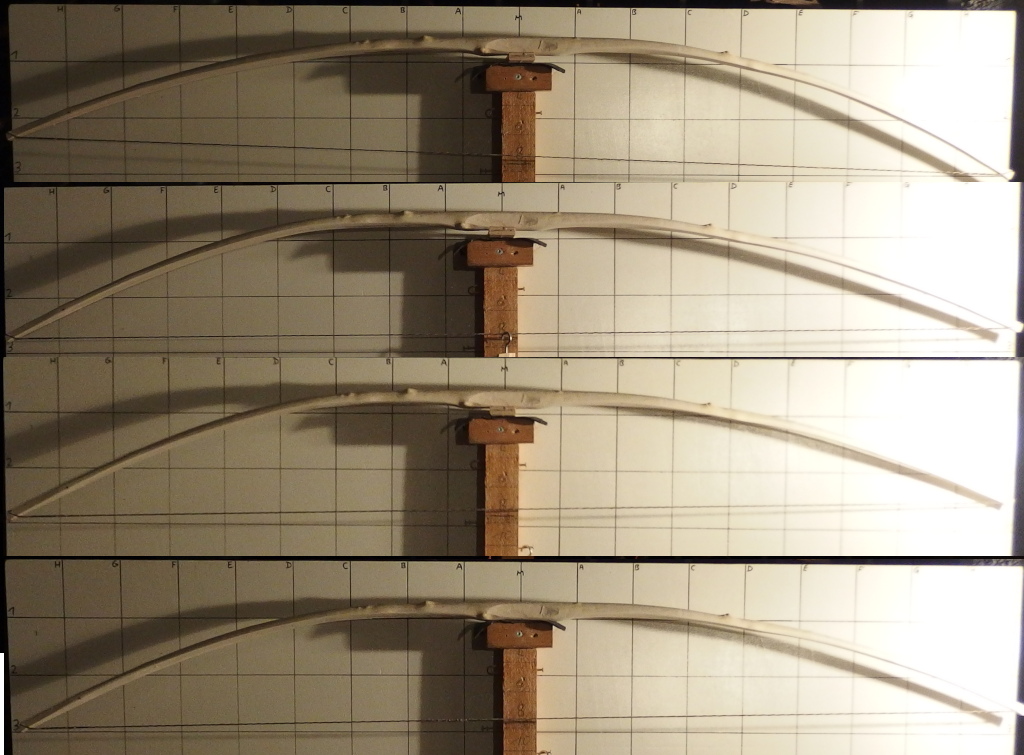 Hallo Thomas, da hast Du absolut recht. Ich hätte direkt am Bogen den Unterschied abgespannt/aufgespannt bzw. die Bewegung dahin prüfen müssen. Hinterher am PC im Vergleich sieht man's. Das war ein Teil des Wegs in den Mißerfolg, weil noch etwas weiter rechts biegt's dann zuviel. Und als ich es links mehr biegen lassen wollte, wurde es dann dort zuviel (in fataler Kombi mit dem träge reagierenden Holz). Mal schauen, ob ich da noch irgendwas machen kann. Selbst wenn er aus dem Sap fällt, kann's noch nen leichten Bogen geben.