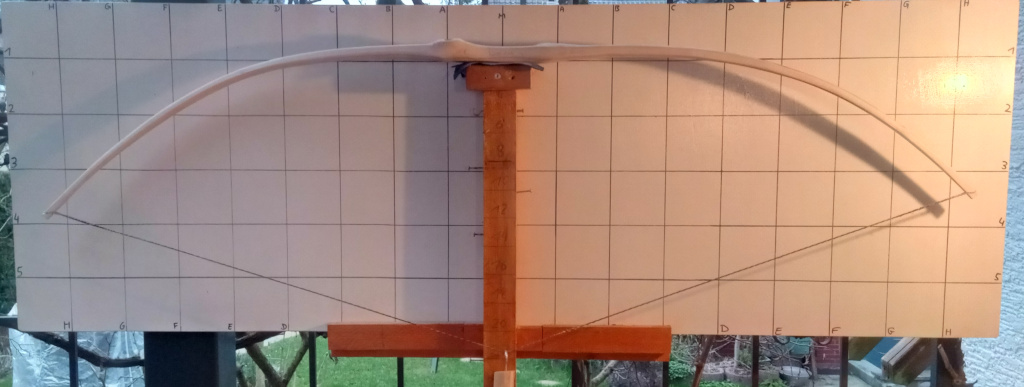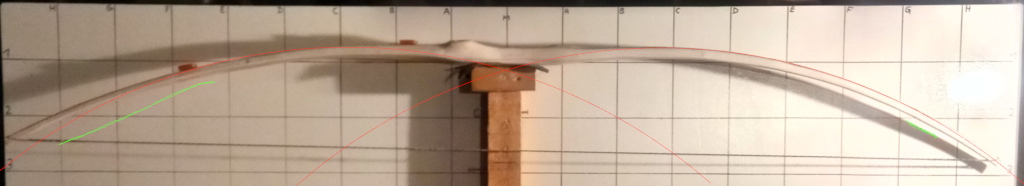 Dann noch hier und da kleinere steife Stellen entfernt (hat noch so 2-3 mit wenigen cm) Und markiert was ich machen würde. Gerade in der Mitte der Wurfarme biegt es mehr. Links außen fehlt noch was, und dann muß ich griffnah mal schauen. Da biegt es, aber könnte noch etwas mehr für eine gleichmäßige Biegung. Der rechte Wurfarm gefällt mir zumindest in der Biegung schon gut, der linke paßt noch nicht so ganz.