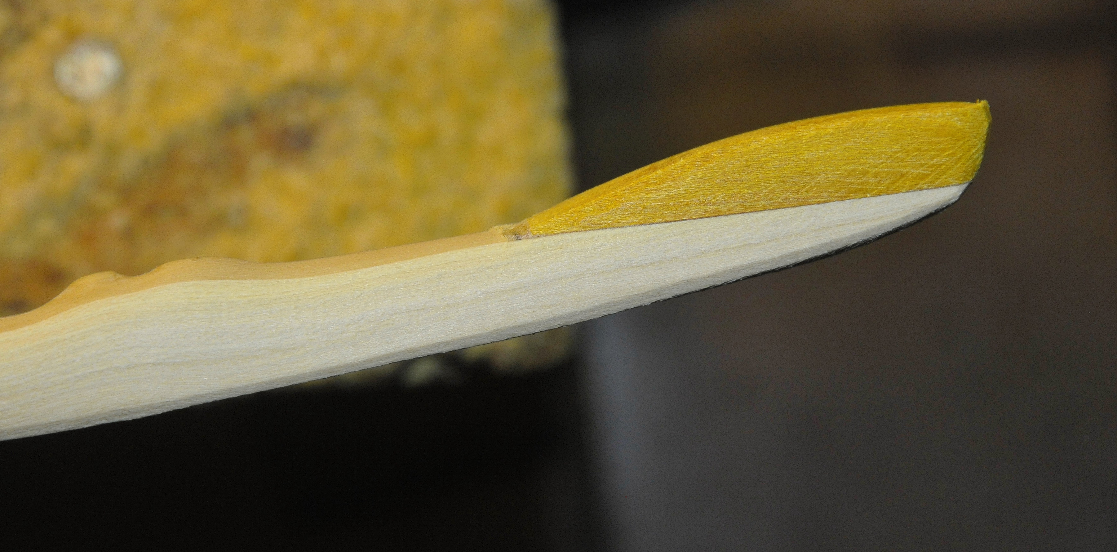 Meine gute gerade Traubenkirsche leidet auch an einer Sehnenschieflage, dämpfen wollte ich nicht also mit der Säge geschnitten, ist echt komisch den Bogen schräg einzusägen, tut weh. Einen dünnen Keil geschnitzt und mit Epoxy rein, hoffe es wird besser.
