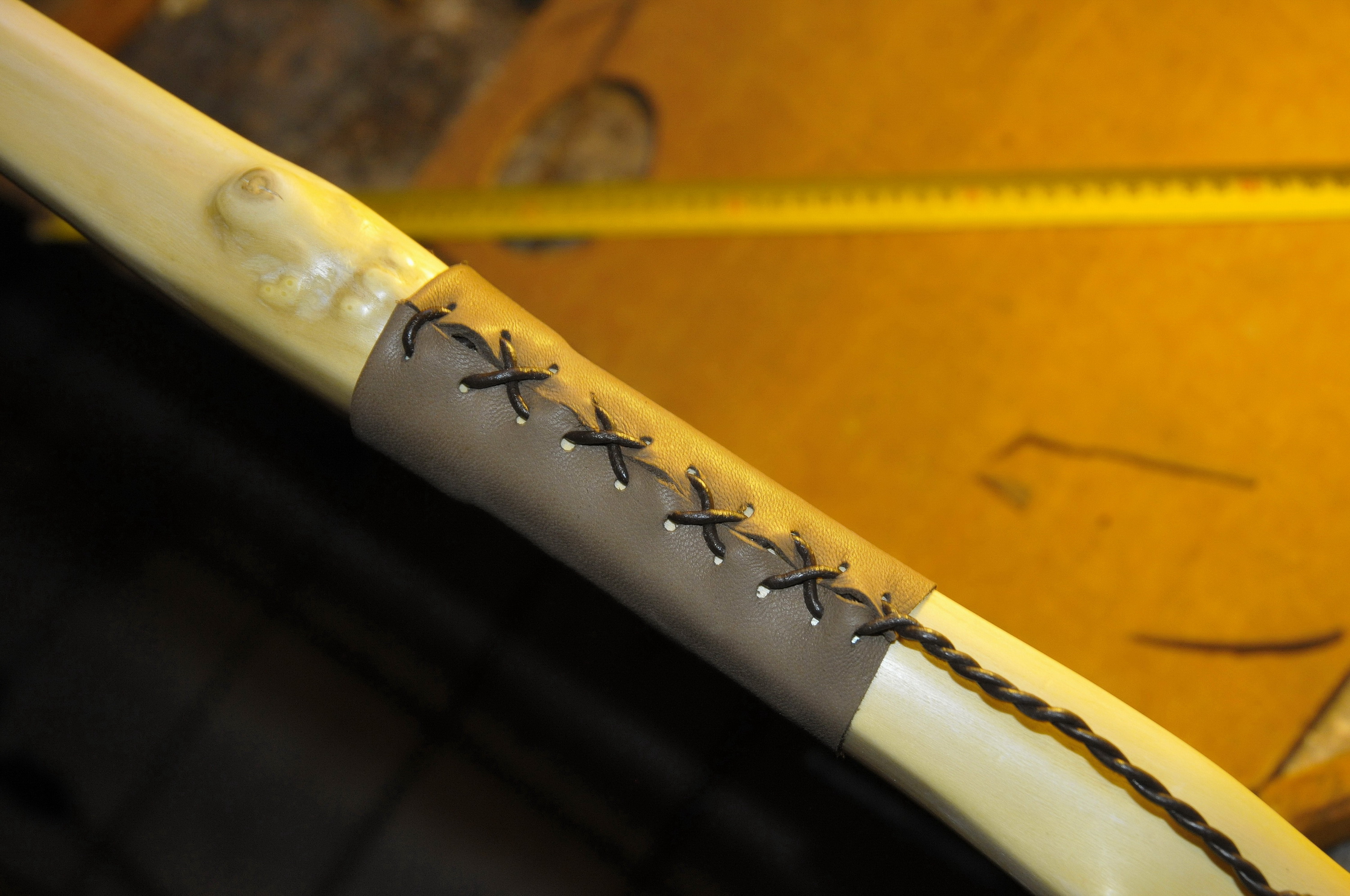 Das Zuggewicht ist leider nur 35# bei 27", es war halt nicht mehr Material vorhanden, der dünne Sapling 3,5 cm hat halt nicht mehr hergegeben, der Markkanal ist noch im ganzen fertigen Bogen erhalten geblieben, daher hab ich ein HL Design versucht.