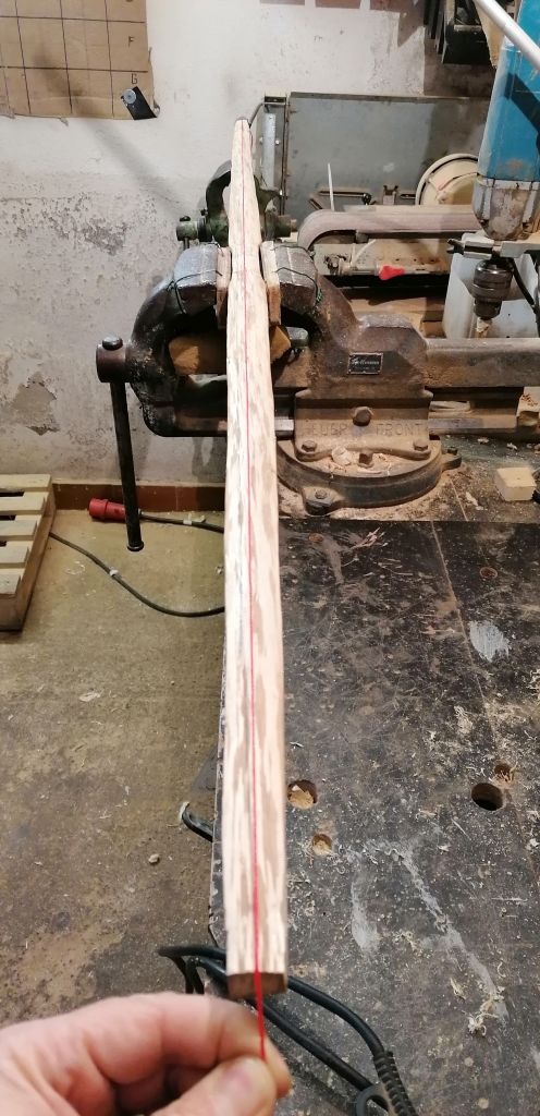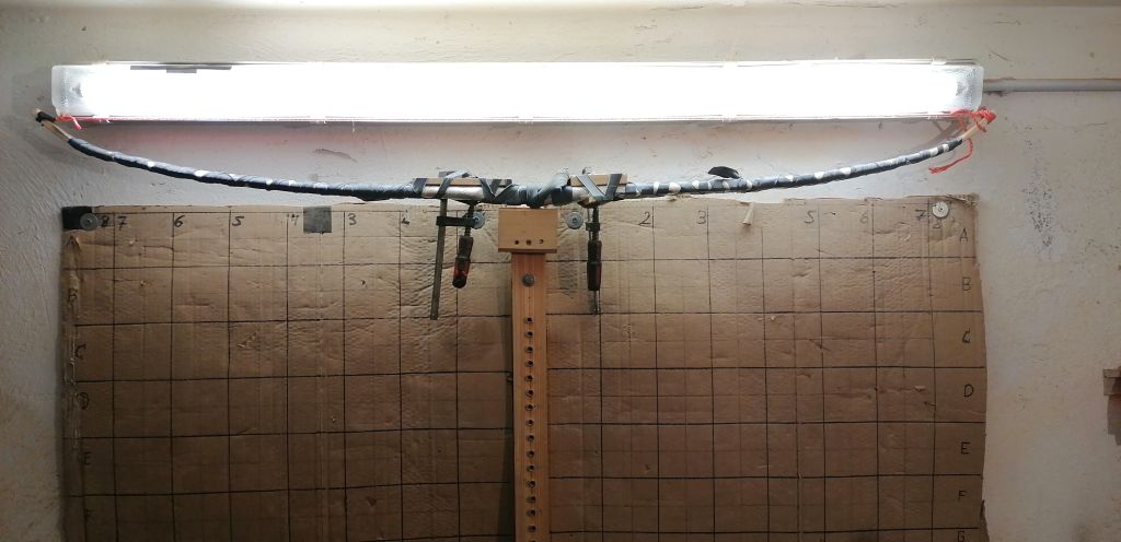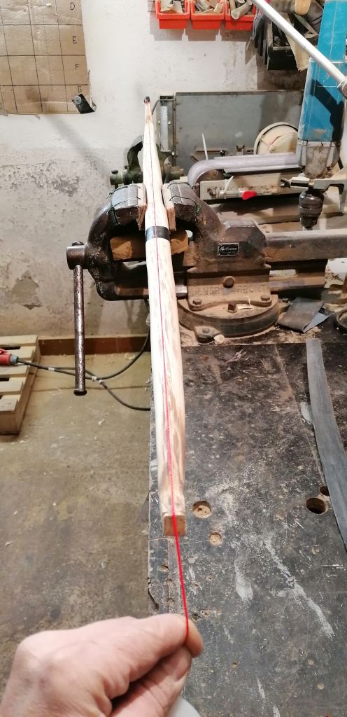 ich habe heute den Bogen ausgespannt und ihn auf die Waage gelegt. Mit 630g dachte ich kann ich mich ans Werke machen. Gesagt getan, kurz vorgetillert und dann aufgespannt. Alles super.... nur er scheint labbrig, also nicht so rückstellfreudig wie gewohnt. Naja dachte mal schauen was raus kommt... das Zuggewicht erhöhte sich aber nicht beim Auszug und dann ein Geräusch das ich kenne und einem einen Schauer über den Rücken laufen lässt... , aber alles gut der Bogen hält. Es hat sich eine Faser vom Rücken aufgestellt. Scheiß drauf Panzertape drum und auf Vollauszug gebracht. Siehe da 33#@32'' und er hält. Dann einschießen mit 60 Pfeilen und er hält. Irgendwie kam ich mir vor wie beim SDBBT 2019 … gell Tom Tom . Nun der Tiller ist immer noch in Ordnung , aber nicht gut . Warum sollte ich da jetzt weite machen. Wenn er noch konform ist, dann bekommt er da eine Wicklung und geht schlicht ins rennen. Bauzeit 24h! Aber ich glaube nicht, dass man damit einen guten Bogen bauen kann, zumindest nicht mit unserem Holz. Ich dachte mit 2,4cm an den Fades sollte er min 45#@28'' bringen... aber da lag ich daneben...