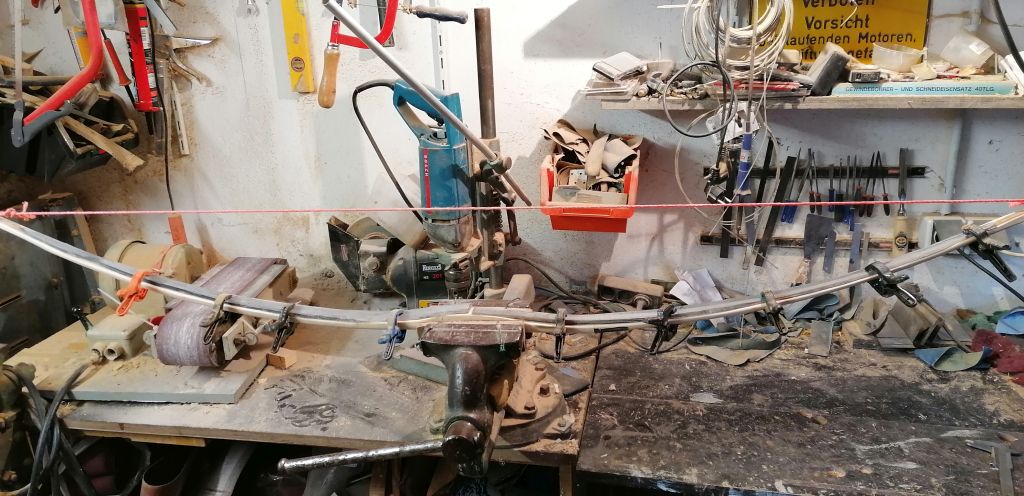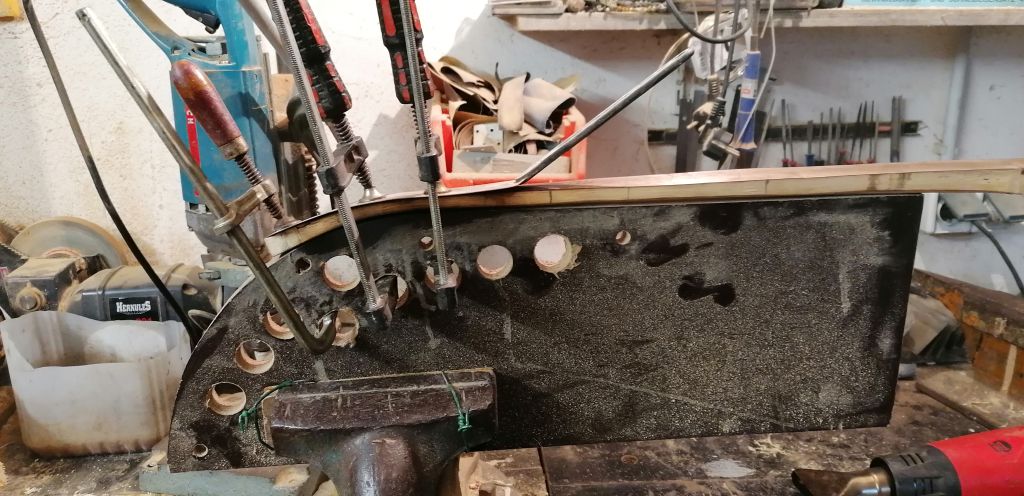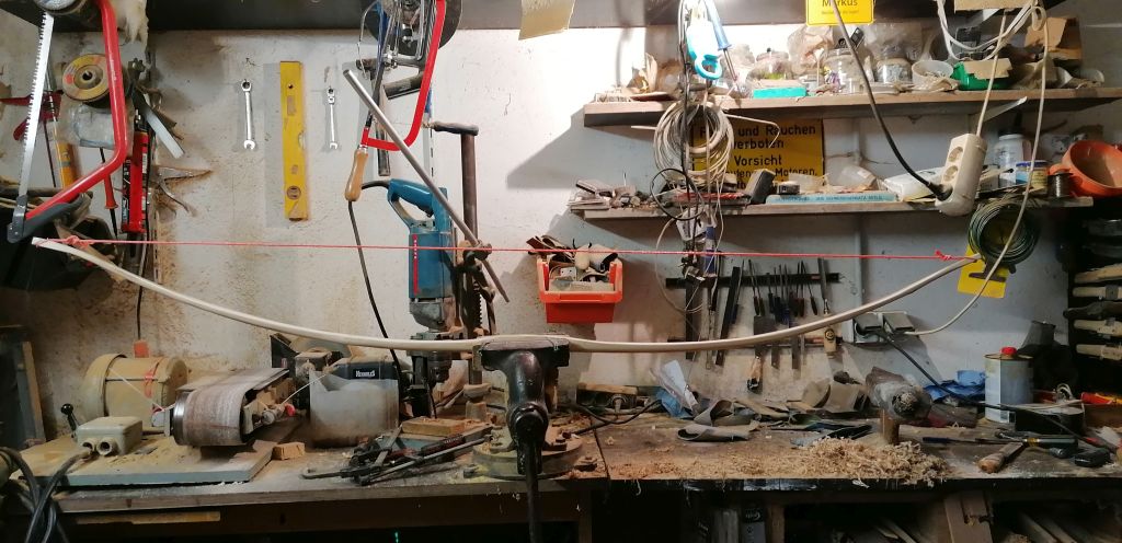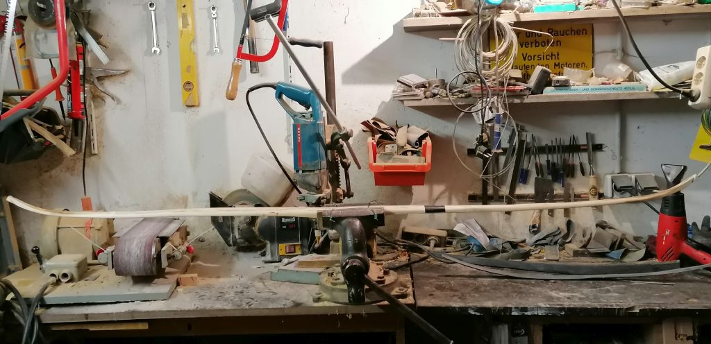 So Folk´s ich habe lange überlegt, ob ich noch mehr Arbeit in den Bogen stecke. Ich habe eine Nacht darauf geschlafen und kam zum Entschluss, ihm eine Chance zu geben. Ich habe für meinen Ägypter Indisches Wasserbüffelhorn (die mit den schmaleren langen Hörner) probeweise bestellt und konnte es für Bogen mit hohem Zuggewicht und starker Biegung nicht gebrauchen. Jetzt lag es die ganze Zeit hier herum und es war irgendwie für kein Projekt zu gebrauchen. Jetzt habe ich mich entschieden das Horn für den Bogen zu verwenden, da ich mit dem Zuggewicht und der Leistung nicht zufrieden war. Außerdem sehe ich das als ein Schulungsprojekt, was man alles mit einem Langbogen machen kann. Ich wollte schon immer einen Hornkomposit ohne langen Hebel bauen. Jetzt habe ich die Gelegenheit dazu Wenn es schief geht so what . Also gesagt getan... Horn auf die Dicke gebracht, Bogen nach getillert und noch etwas Zuggewicht genommen. Sonst fürchte ich einen 100# Bogen zu bauen und die Zeit für 3 Schichten Sehnen habe ich nicht. Das Horn habe ich ohne zu Rillen verklebt, da ich aus Zeitgründen darauf verzichtet habe. Geklebt habe ich das Horn mit Epoxidharz. Ich habe das bisschen Set was er hatte heraus geföhnt und die geflippten Enden ein wenig mehr gebogen. Der Bogen wird noch schmaler werden, denn er ist noch über 4cm breit und das braucht es mit dem Horn nicht mehr. Nun bin ich gespannt ob sich das alles lohnt und ob ich es in der Zeit schaffe