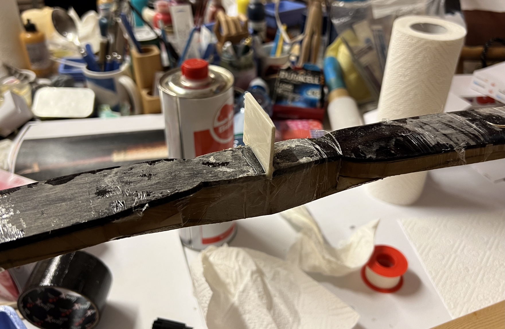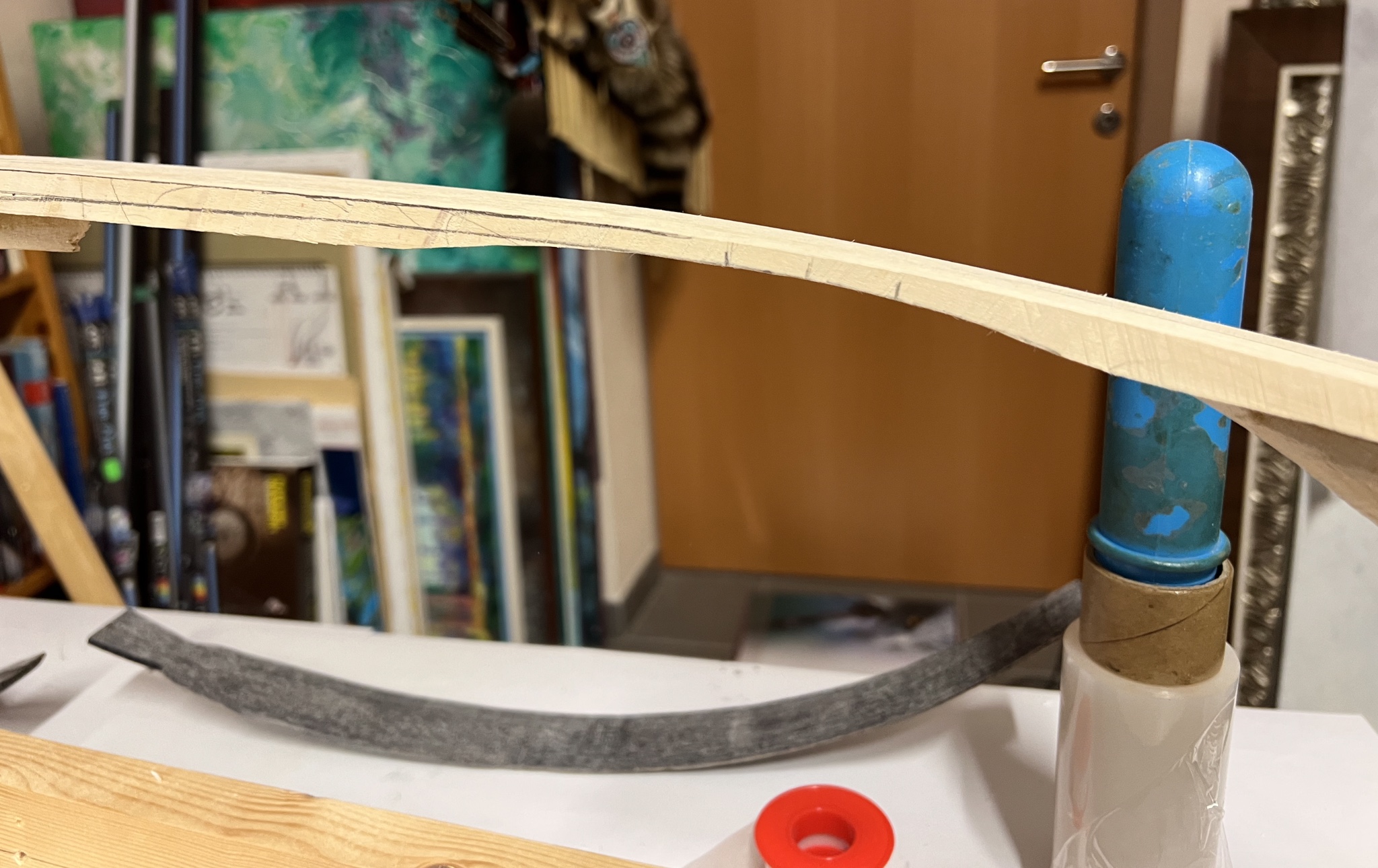 So, heute den Kompositbogen weiter gebaut. Der Wurfarm wird zuerst im Bauchbereich plan geschliffen und dabei beide Seiten in eine Ebene gebracht, dann wird nur im Bereich des Kasanauges der Wurfarm auf 5mm verschmälert. Dann wird der Bogen an eine Holzlatte geklemmt und dabei rückwärts vorgespannt. Der bestehende Deflex wird im Kasanauge durch das Vorspannen in einen leichten Reflex gezwungen. Dann werden die Hornplatten in der Breite angepasst. Auch hier wird die Dicke belassen. Der Holzrahmen und die Hornplatten werden erst nach dem Verkleben in Form gebracht. Verklebt wird mit Uhu Endfest 300. Beidseitiges Aufbringen des Klebers, intermittierendes Fixieren mit 2 Klemmen. Fixieren mit Klebestreifen, damit der Kleber bleibt, wo er sein soll wickeln mit einer Paketfolie. Dann erst die Klemmen drauf und warten bis morgen.