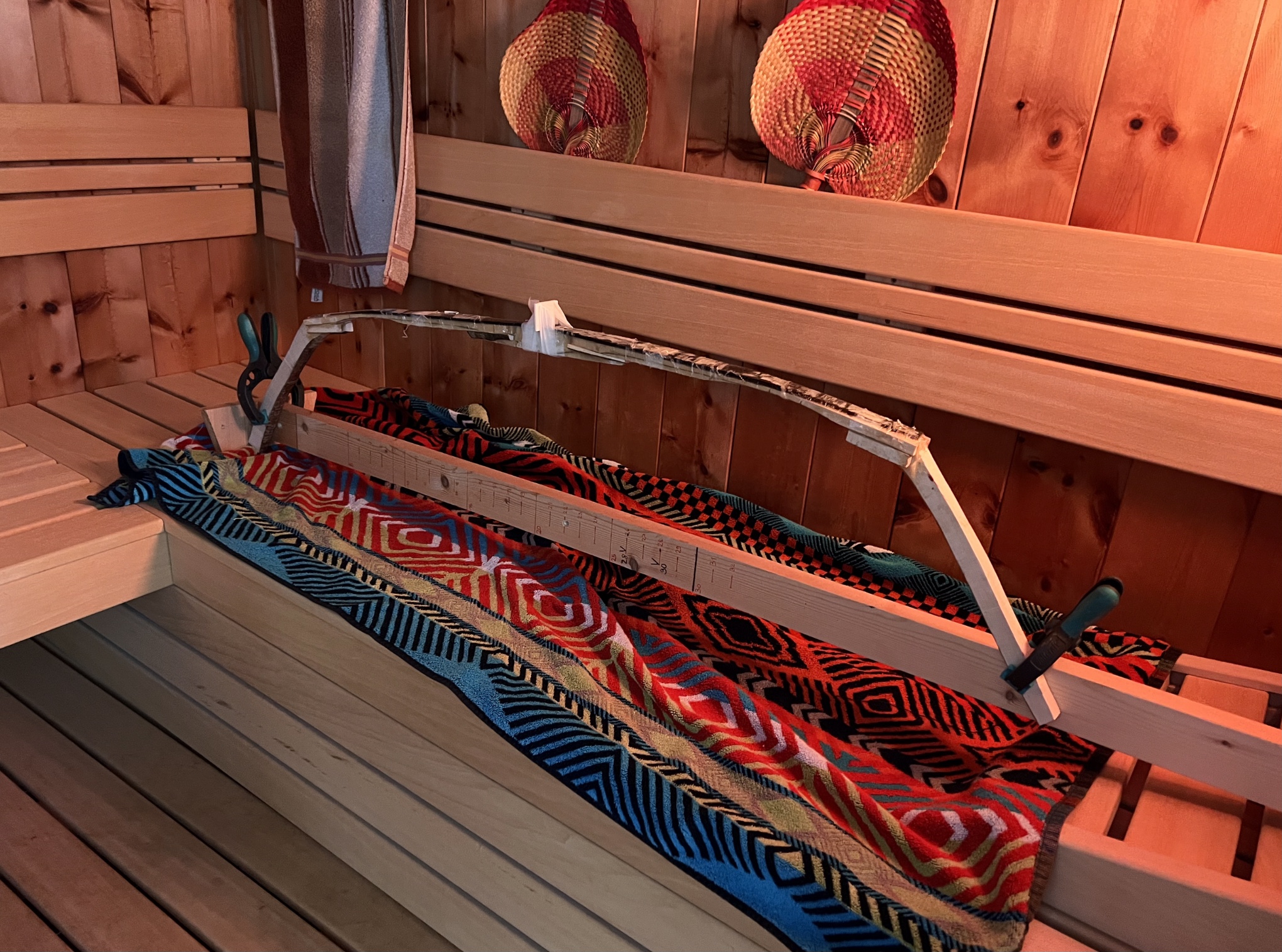 Keine Sorge! Ich verbaue Straußensehnen. Aus den Sehnen am Op-Tisch wurde ein schönes neues vorderes Kreuzband. Sehen aber ziemlich gleich aus. Ich klopfe die Sehnen auf einem flachen Stein. Dann beginne ich die Sehne in der Längsmitte aufzureissen, ohne die Querverbindungen zu zerstören, dann präpariere ich in Richtung der Enden und zwar so, dass ein flaches Band entsteht. Meist besteht eine Torsion, das muss man beim Auftrennen berücksichtigen, beim Chiasma (dort wo sich die Sehnen X förmig Kreuzen) muss man sehr behutsam sein. Wenn es sich hier nicht lösen läßt, schneide ich das Chiasma weg. So erhalte ich 2,5cm breite und 40cm lange Streifen. Zusätzlich präpariere ich normal große Sehnenstränge zum seitlich Anfügen. Zwischenzeitlich war der HASELRESTE-KOMPOSITBOGEN in der Saune bei 50 Grad zur Trocknungsbeschleunigung der letzten Epoxyverklebung. Das Saunahandtuch ist natürlich das von meiner Frau, könnte ja was runtertropfen