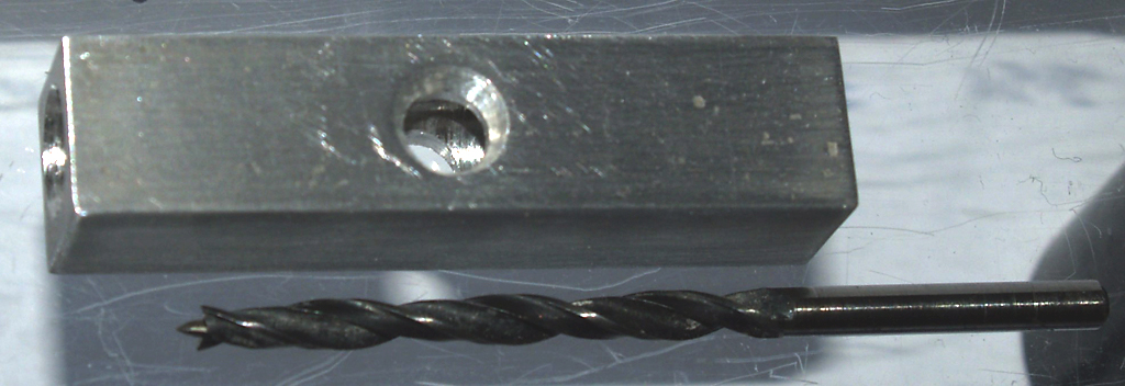 Alu-Reststück, 60 x 14 x 14 mm, zuerst durchgängige 4mm-Bohrung, dann von links 9mm-Bohrung (geringes Spiel zum Schaft) 35mm tief. Mittig Querbohrung.