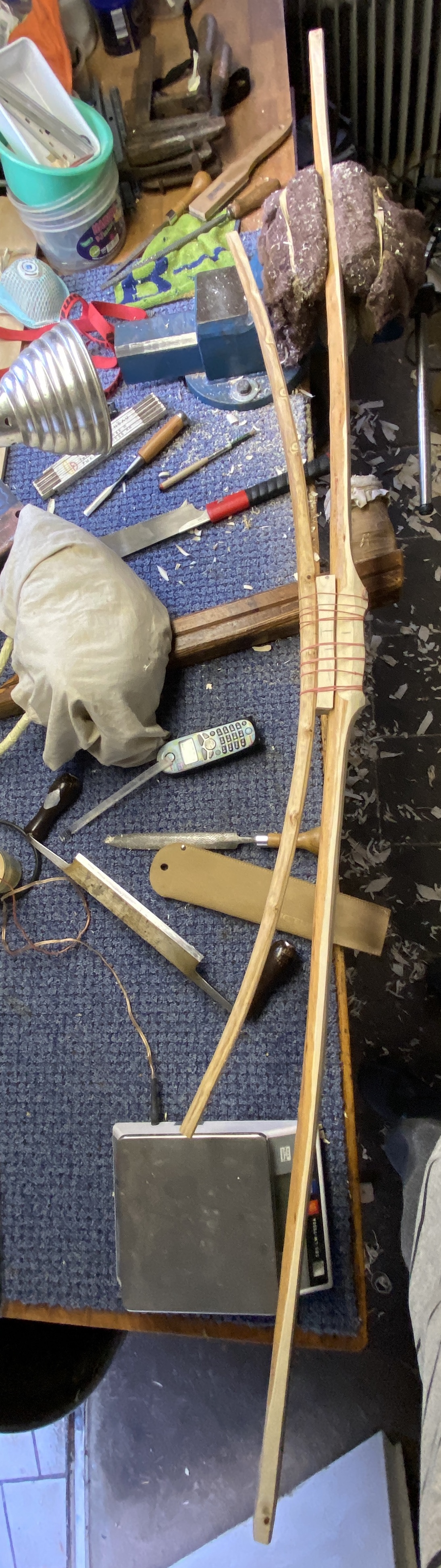 Im Moment verliert das Holz noch 3g pro Tag und mit Ziehklinge und Raspel läßt sich so langsam vernünftig arbeiten. Zum tillern ist er mir aber noch zu feucht. Langsam kann ich damit wohl ins Haus umziehen.
