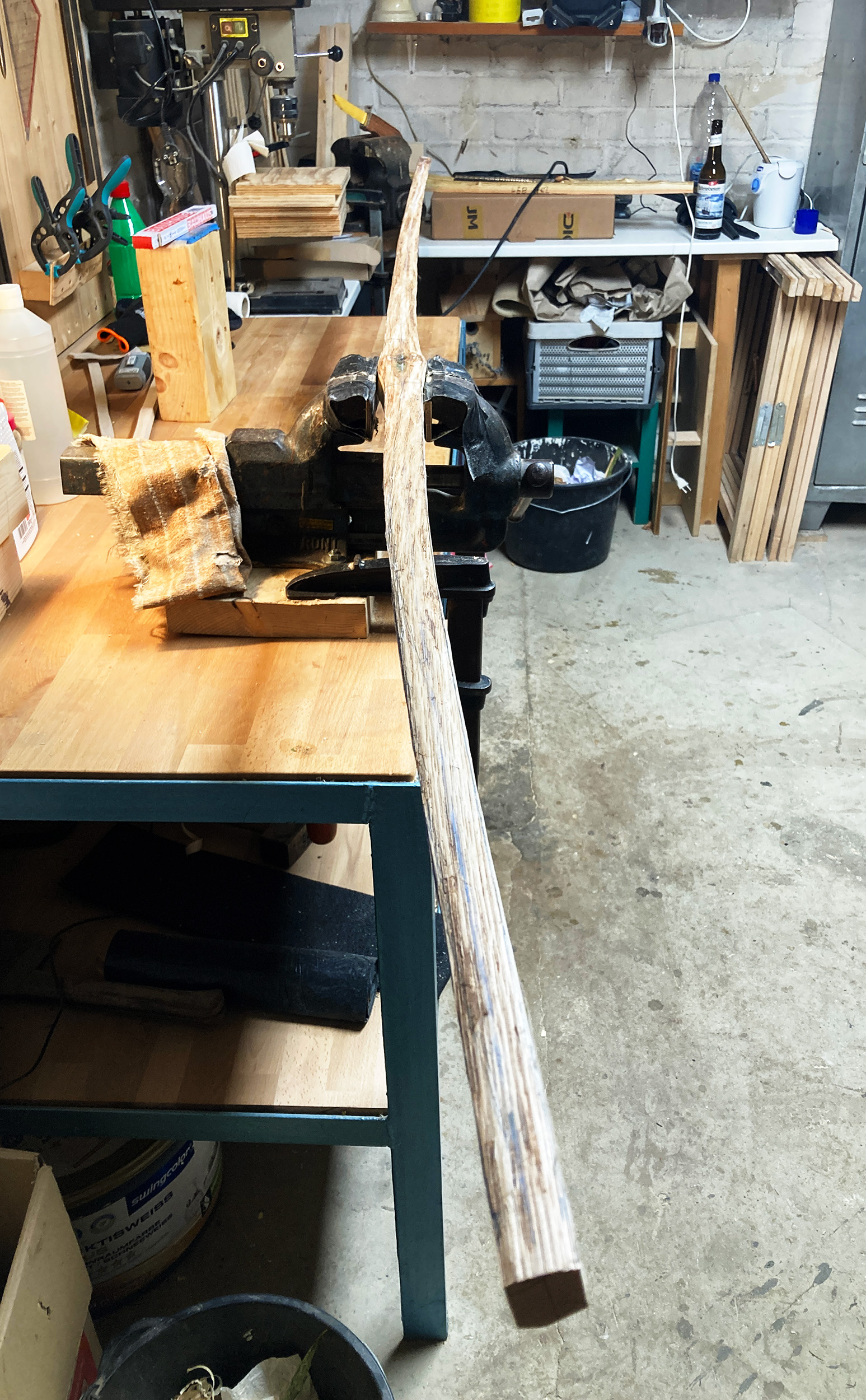 Der Hasel als Ersaz wurde eher stiefmütterlich behandelt, jetzt scheint trotzdem der erste Bogen daraus zu werden. Beim Trocknen hat der Drehwuchs das Ding schön verdreht, aber mit trockener Hitze ließ sich erfolgreich dagegen anarbeiten.