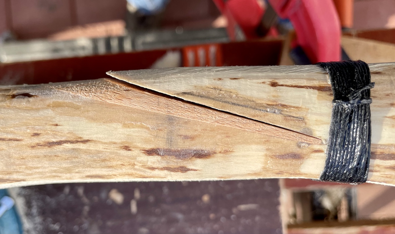 Zuwenig Kleber ist gut möglich, vermutlich hat es den herausgedrückt als ich den Keil reingetrieben habe, Gebogen hab ich aber anschließend nicht im Griff sondern im ersten Drittel der Wurfarme.