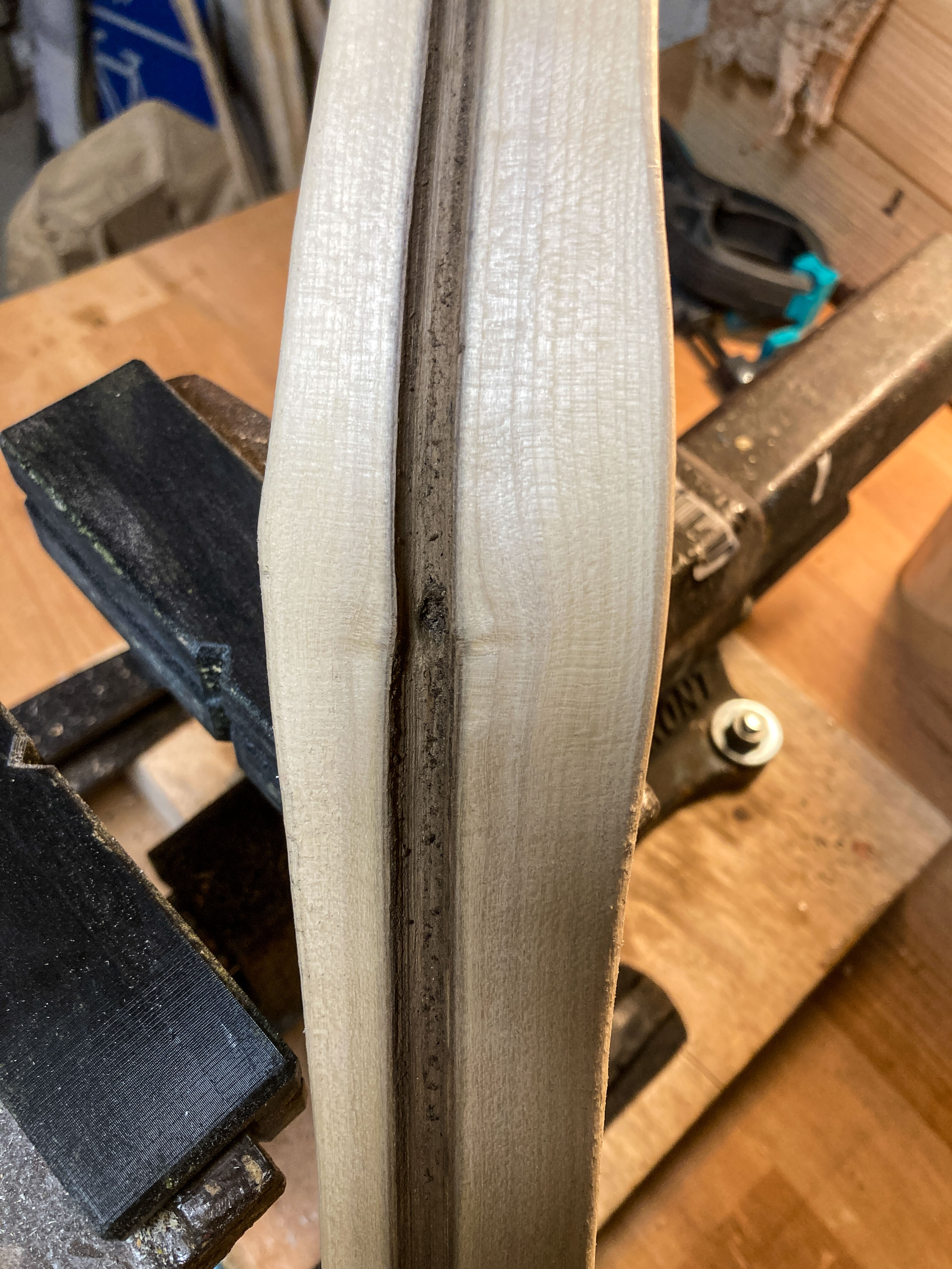 Die Robinie ist zwar eine Robinie, in diesem Fall aber für ein Backing eher ungeeignet und wird deswegen irgendwann ein Selfbow. Ich habe die Splintdicke unterschätzt und der Rücken würde sehr rund werden, da ich breit Baue, um die Buche zu schonen, passt das schlecht zusammen.