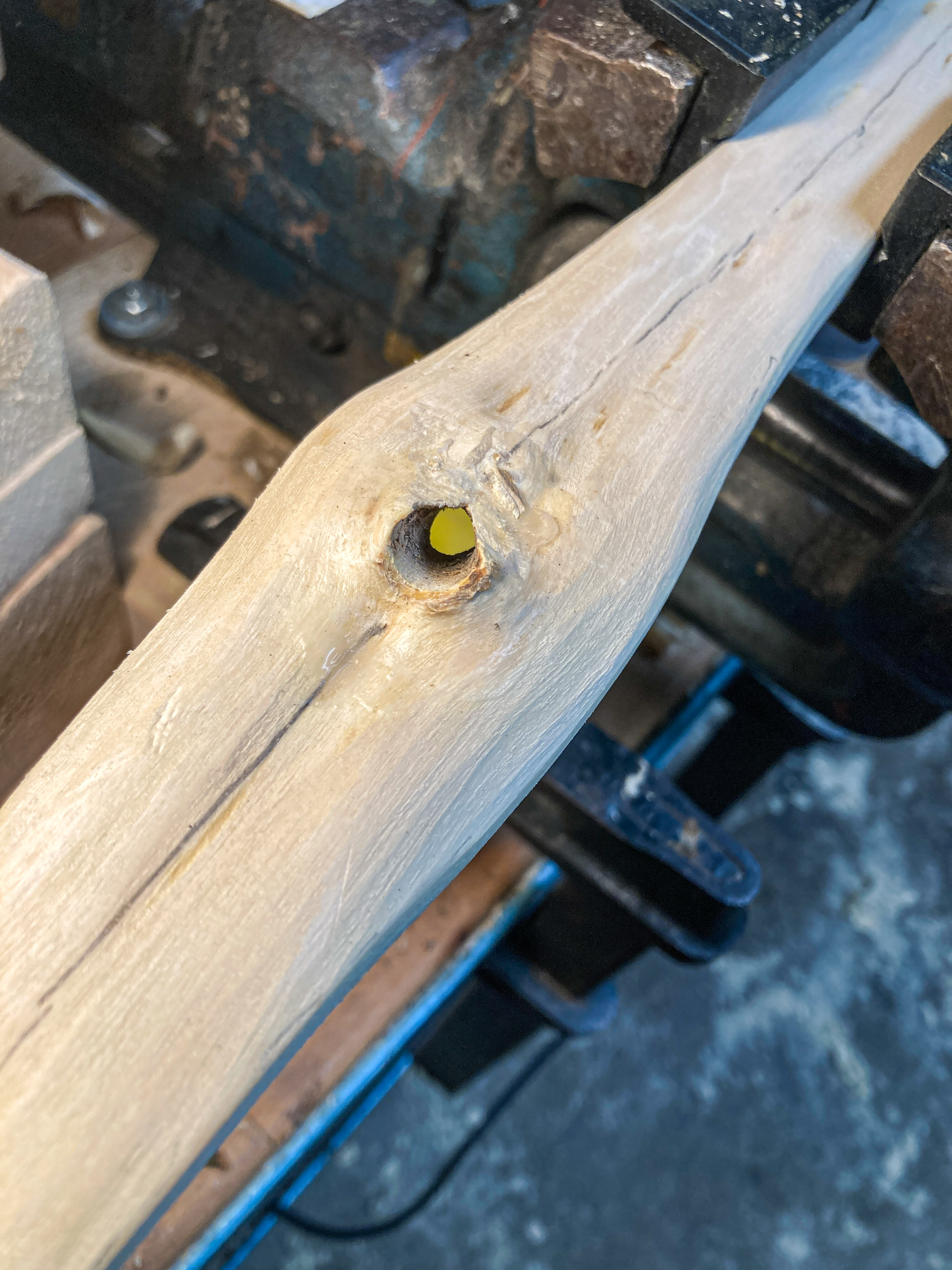 Die Form wurde weiter herausgearbeitet und ich habe mir den gammeligen Markkanal angeschaut. Mit der Ziehklinge habe ich versucht den Gammel zu entfernen, an einigen Stellen geht die Verfärbung noch tiefer, mal sehen was beim Tillern noch verschwindet. Das Holz verfärbte Holz wirkt nicht groß anders als der Rest.