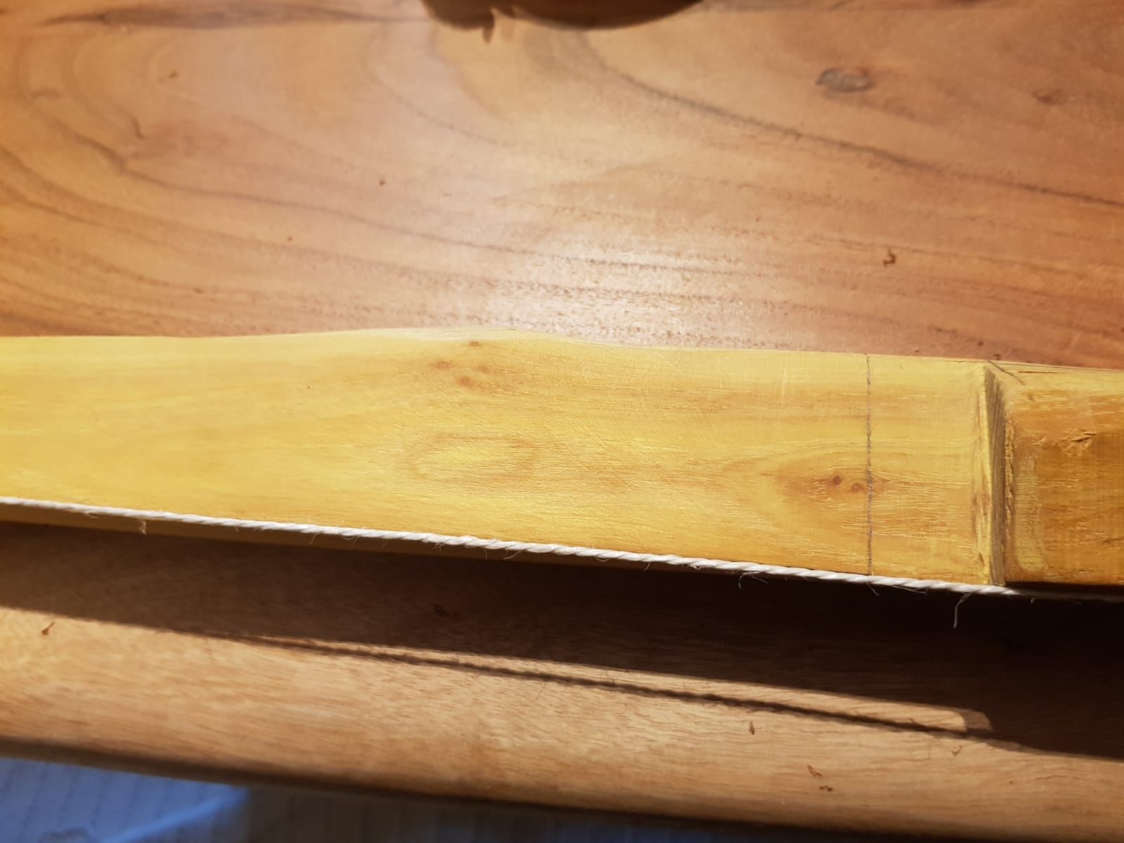 Nun ist der Bogen ja schon ausgeschnitten, aber wenn das letzte Bild (mit der aufgeklebten Schnur) den ursprünglichen Stave zeigt, hättest dir einiges ersparen können, wenn du den Bogen im Griff geknickt hättest. Dabei hättest du das kameranahe Wurfarmende nach rechts Richtung Mitte des Staves verschoben und den geknickten Bogen ausgeschnitten. Danach den Bogen mittels Hitze oder wolfschem Keil im Griff begradigen - fertig.