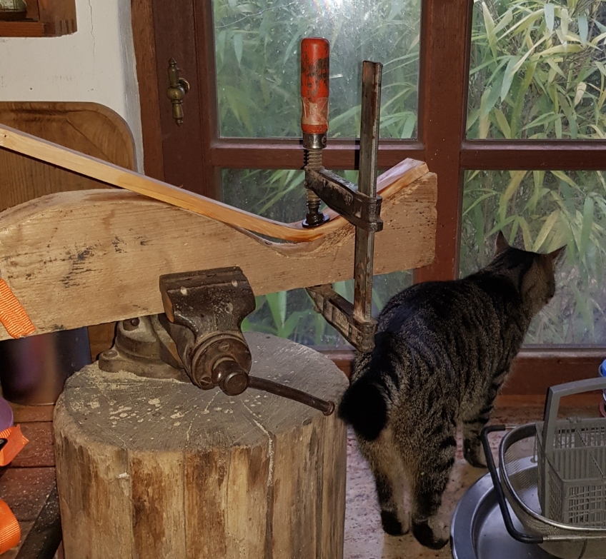 Benzi! Ich kann Dir verraten, wie man Fichte biegt. Eines meiner Birkenrindenkanus hat Rippen aus Fichtenleisten mit liegenden Jahresringen. Du musst die Leisten pro Millimeter Dicke 1 Stunde wässern, d.h. bei 1cm Dicke 10 Stunden in kaltem Wasser, die Leisten müssen dabei vollständig unter Wasser sein, dann stehend in einem Kessel 1 Stunde Kochen und Dämpfen. Du kannst die Leisten dann butterweich übers Knie biegen (Lederfleck unterlegen) aber immer 2 aufeinanderliegend gleichzeitig, die Äußere kann dabei manchmal Knicken. Dann zum Trocknen einspannen in einer Form. Überm Feuer ist schlecht, besser gleich unter den Rost ins Feuer legen,