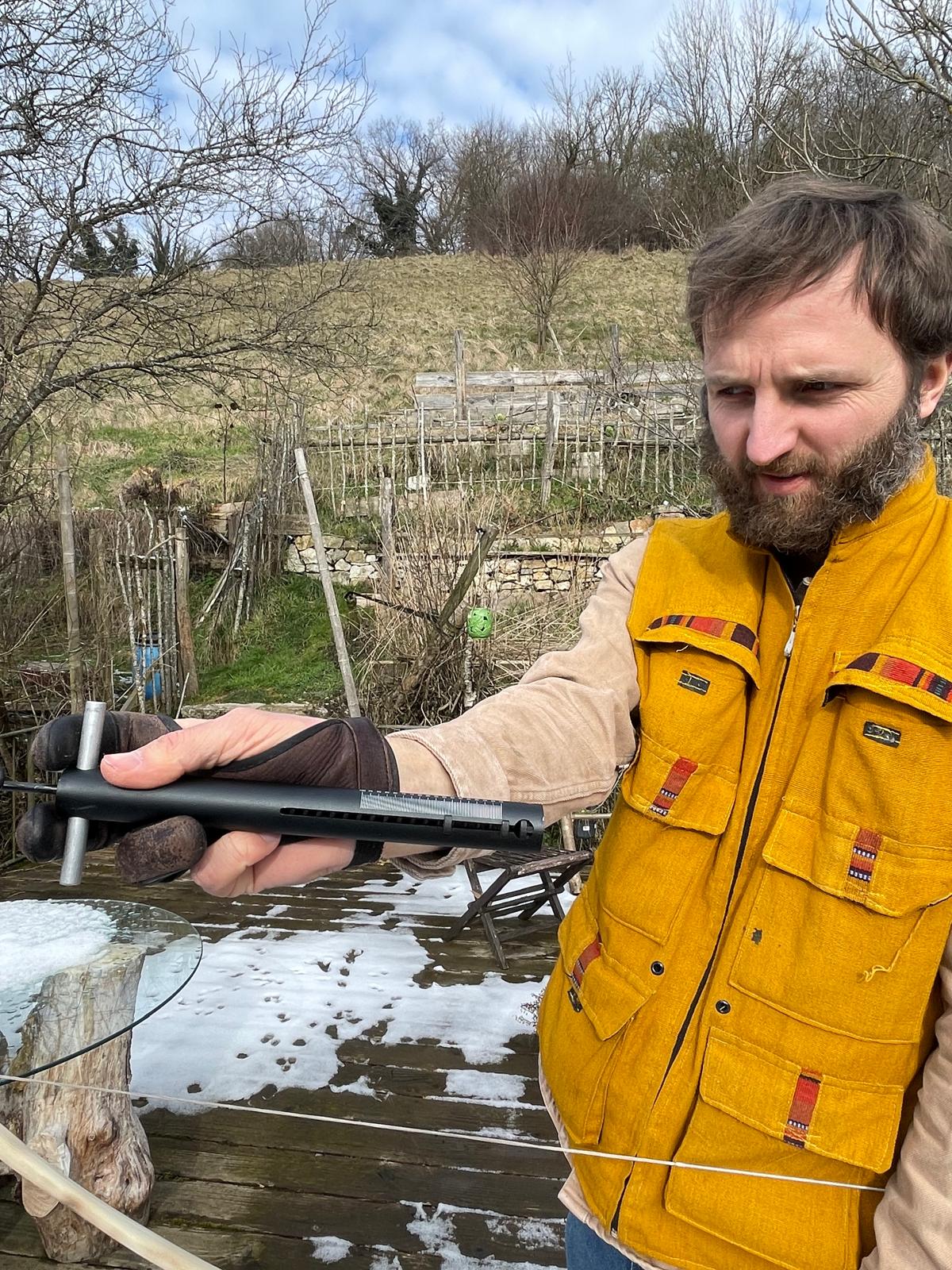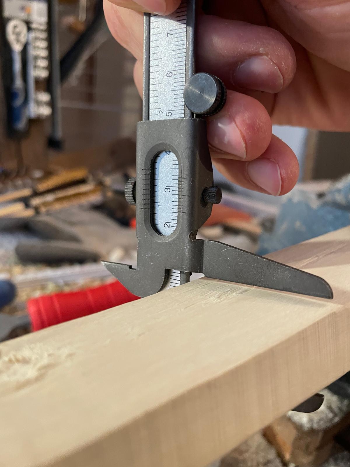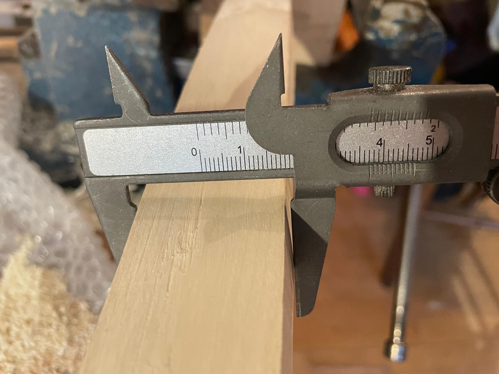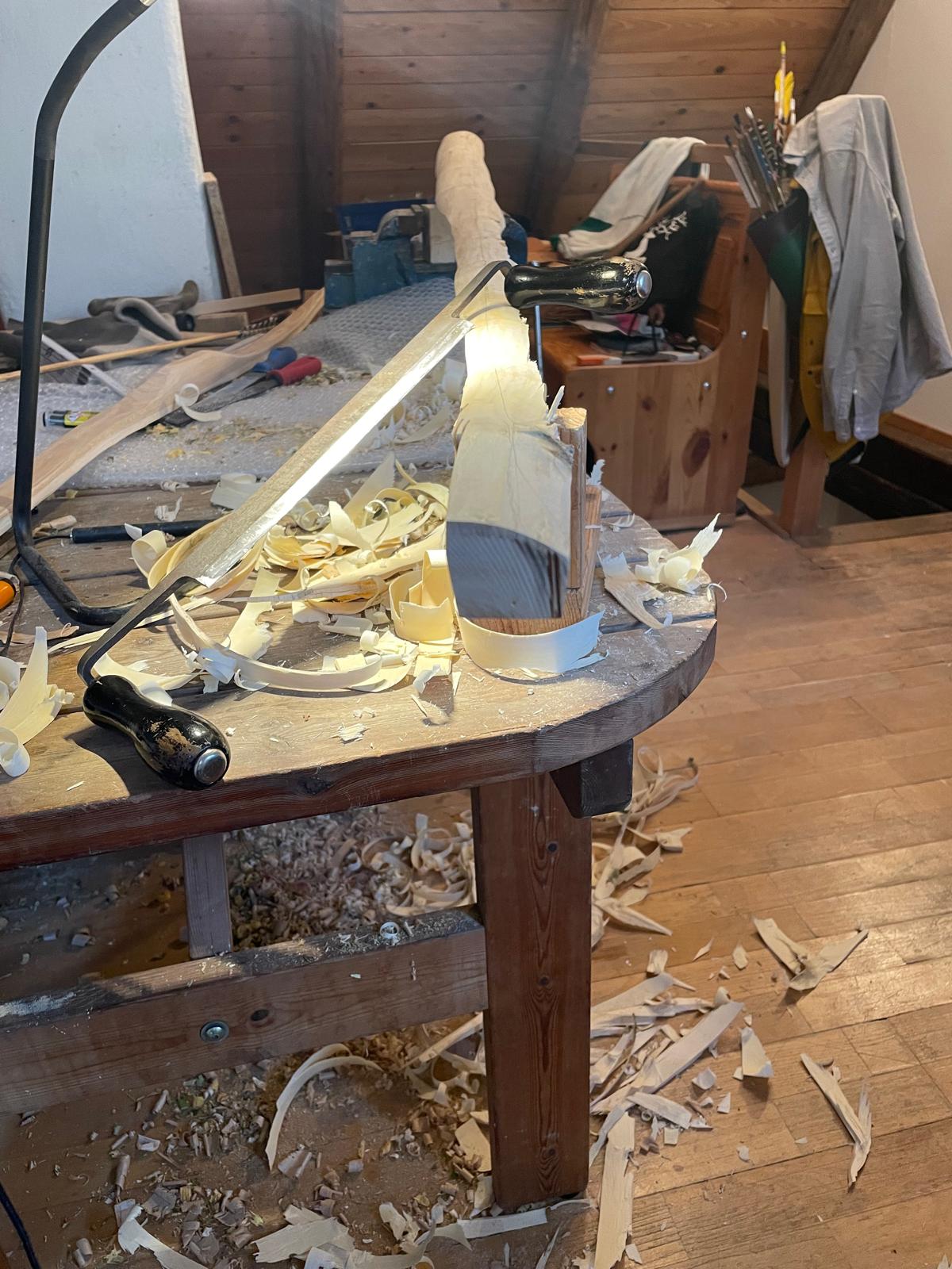 Anfangs im kalten Keller trocknen. Wenn man schnell auf Stave-Abmessungen kommt, hat man viel der Spannung aus dem Holz genommen und das Reißen wird minimiert. Nach der Arbeit den Stave auf einer Bohle fixieren, eventuell mit Unterlagen an den Enden für einen Reflex.