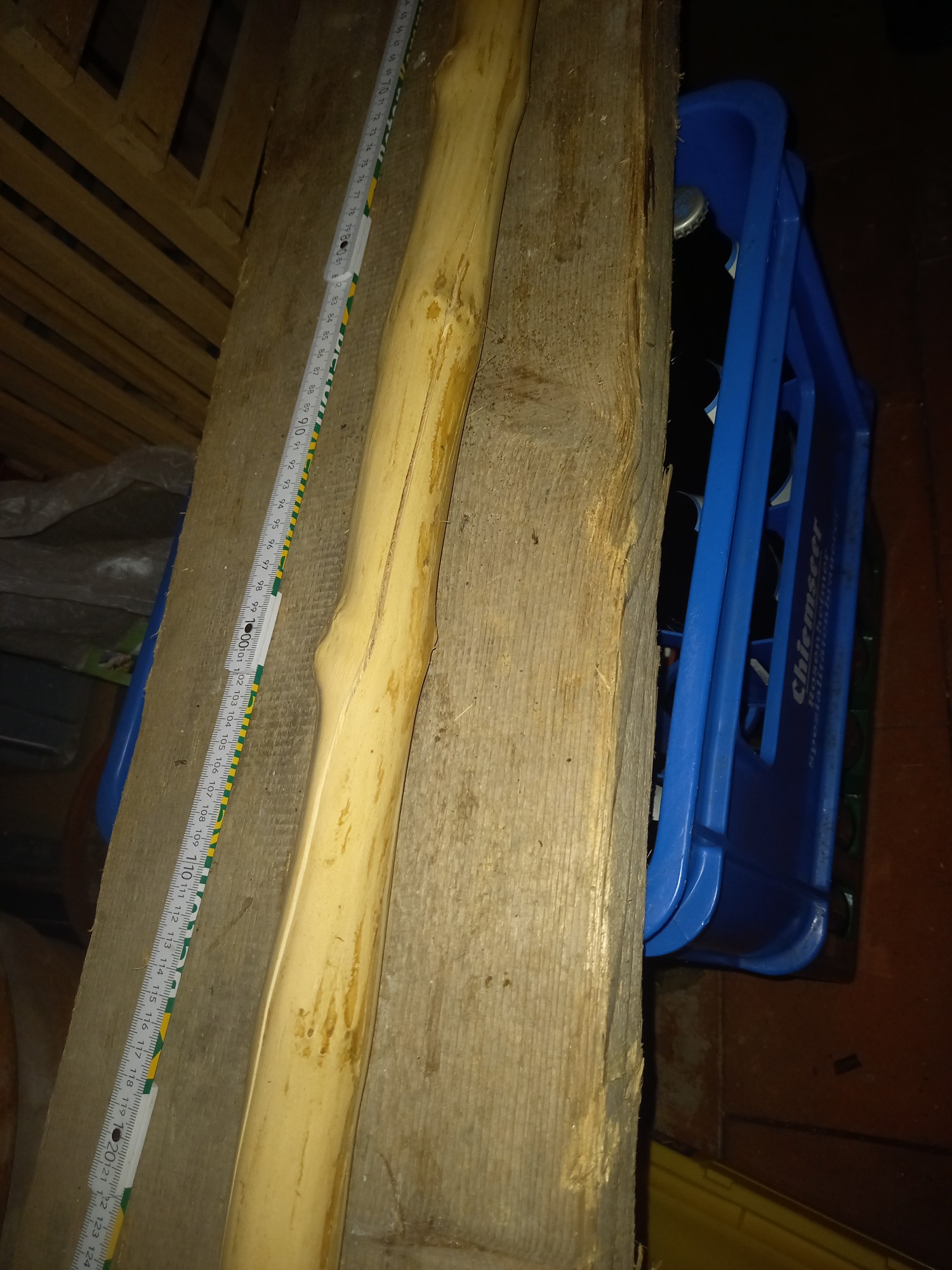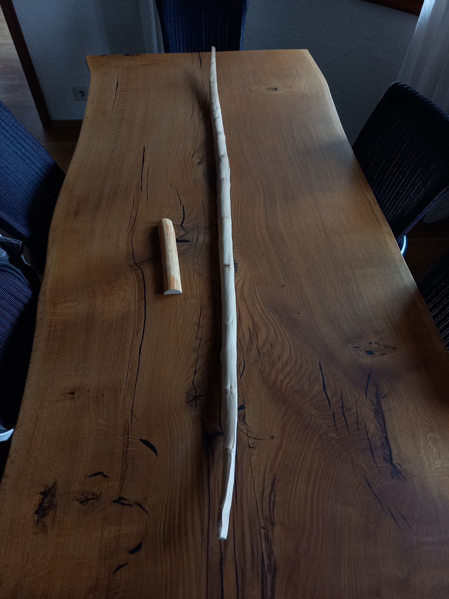 Der Streifen rechts ist ein zugesägtes Holzstück von der Kirsche, die ich für den Griff verwende