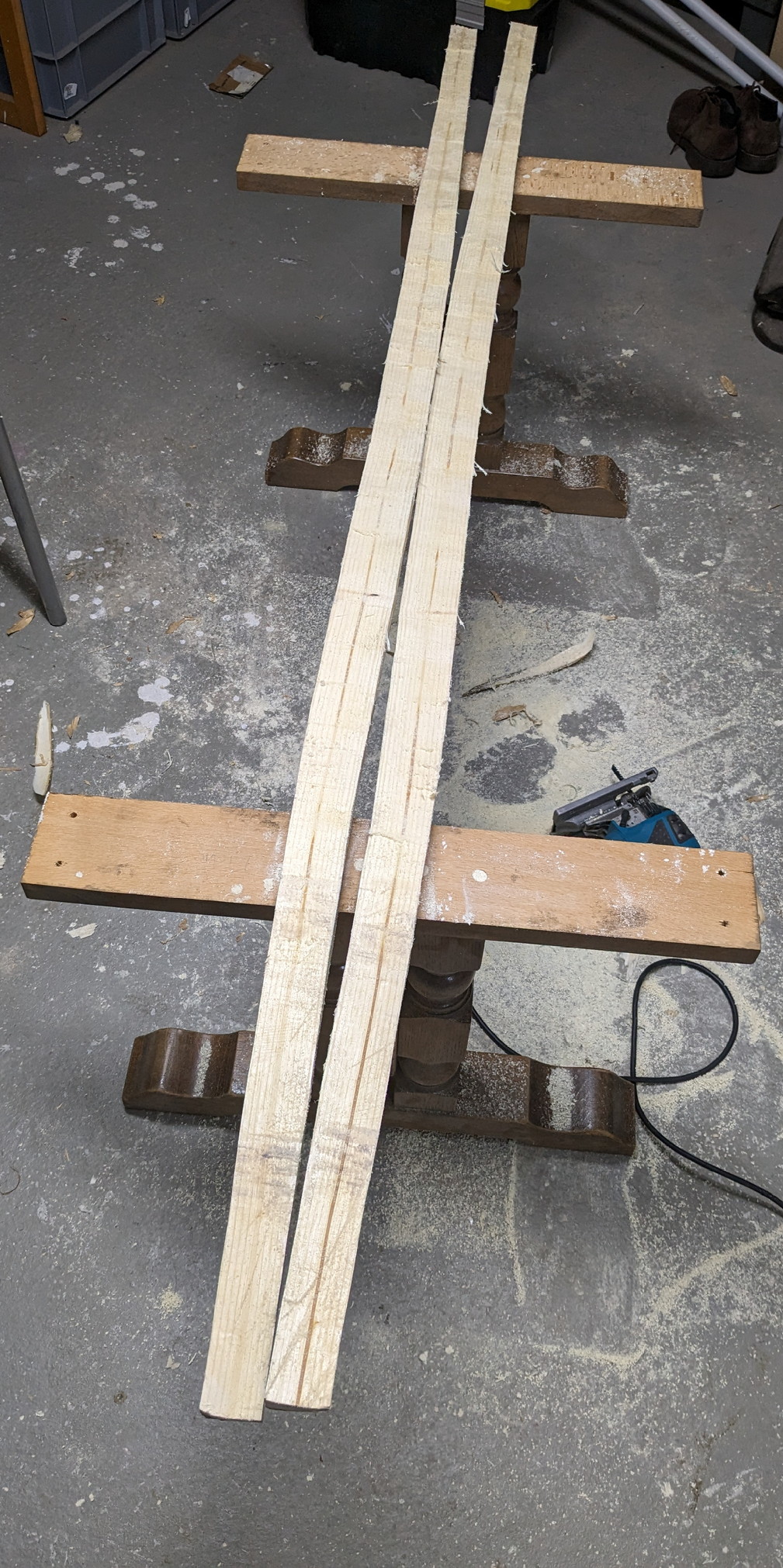Stave wurde etwas in der Dicke reduziert und die Form vorbereitet (Löcher für die Zwingen fehlen noch). Mal schauen ob ich heute noch biege oder morgen...