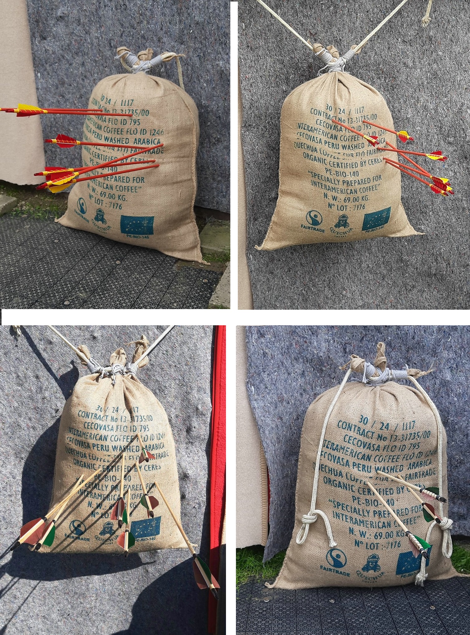 Gefüllt habe ich sie mit sauberen Folieverpackungsresten, Schaumstoffstückchen, Zwiebel- und Kartoffelnetzen und Heu- und Strohrollenumwicklungen von der Pferdezüchterin im Ort. Das ganze immer wieder gut stopfen, auch besonders die Ränder, und zum Schluss zubinden. Prallen zuviele Pfeile ab, dann ist der Sack zu straff gestopft oder der Bogen für die Sackfüllung zu schwach. Dann etwas Füllung rausnehmen. Im umgekehrten Fall genau andersherum verfahren.