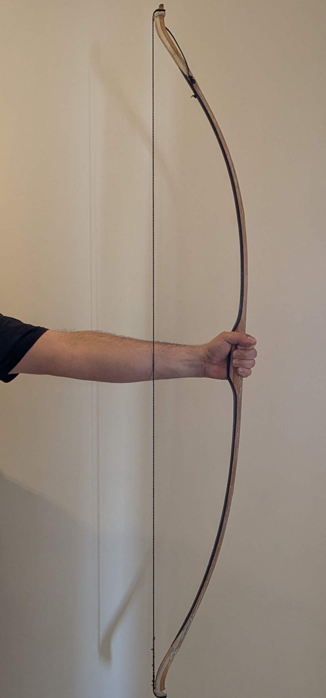 Das Ziel von 50# oder knapp drunter hab ich verfehlt. Es ging viel schneller runter als ich gedacht hätte. Ich bin jetzt bei 41# @ 28 Zoll. Durch die Kürze des Bogens und der Asymmetrie fällt es mir etwas schwer den Tiller richtig zu beurteilen. Mein erster Gedanke war das der untere WA mehr biegen müsste, aber ich glaube da täusche ich mich.