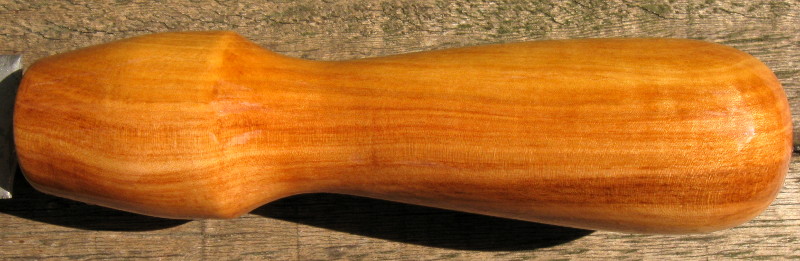 Ich dachte eigentlich ich hätte noch ein Heft hier, aber merkwürdigerweise ist es verschwunden. Da ich noch so einige nette Stücke Apfel hier habe, hab ich mir kurzerhand einen Griff selbst gemacht. Eine Dreh-/Dreckselbank habe ich nicht, also war Freiluftschneiden und Raspeln angesagt und was soll ich sagen, das Ergebnis kann sich sehen lassen: