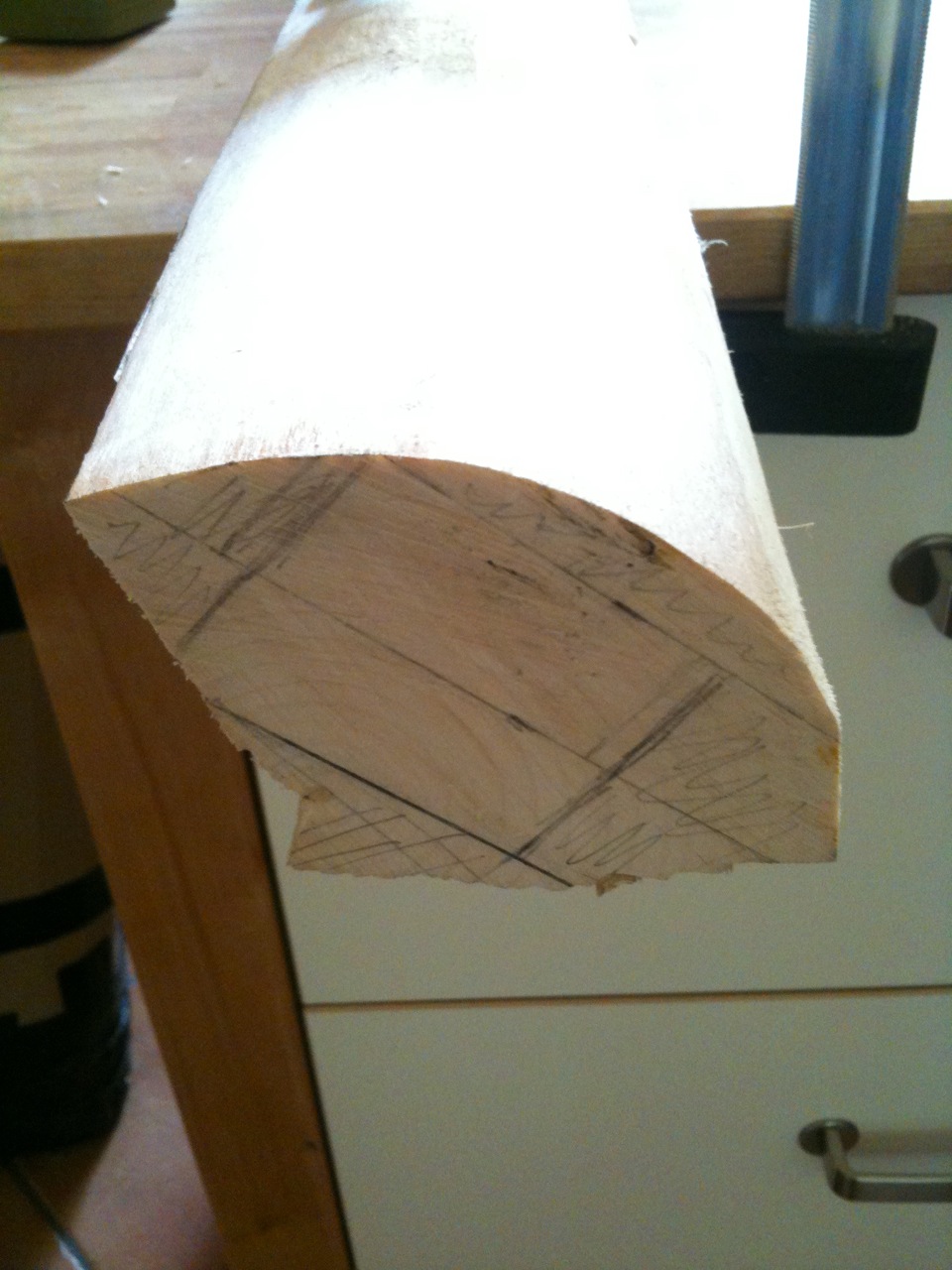Aber um die beiden Wurfarme herauszulösen, werde ich nicht um eine Bandsäge herumkommen - meine Stichsäge hat bei einem Probeschnitt viel Mühe gehabt, und mit der Japansäge würde es ewig dauern... Mal schauen, ob eine Tischlerei in der Nähe das übernehmen kann.