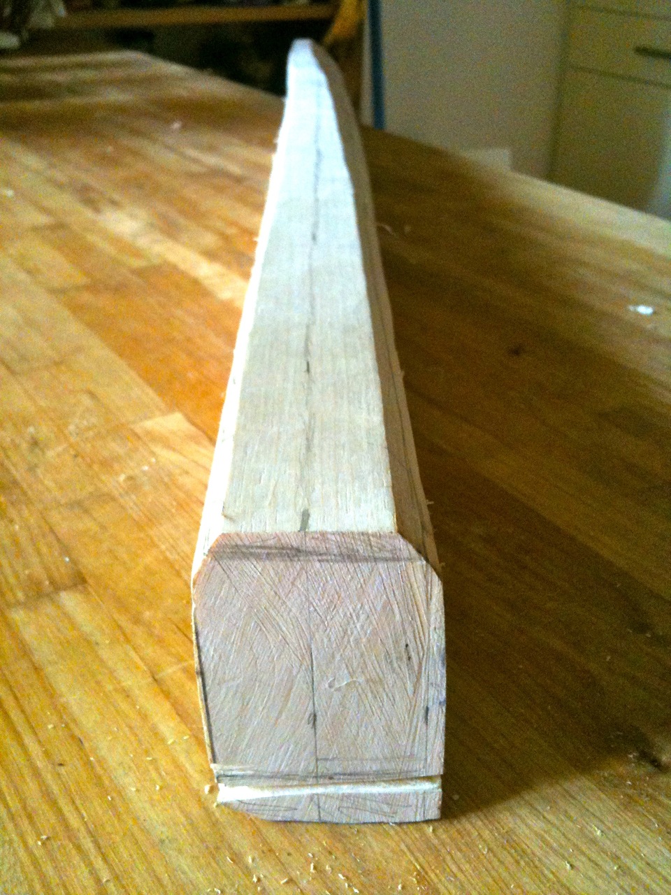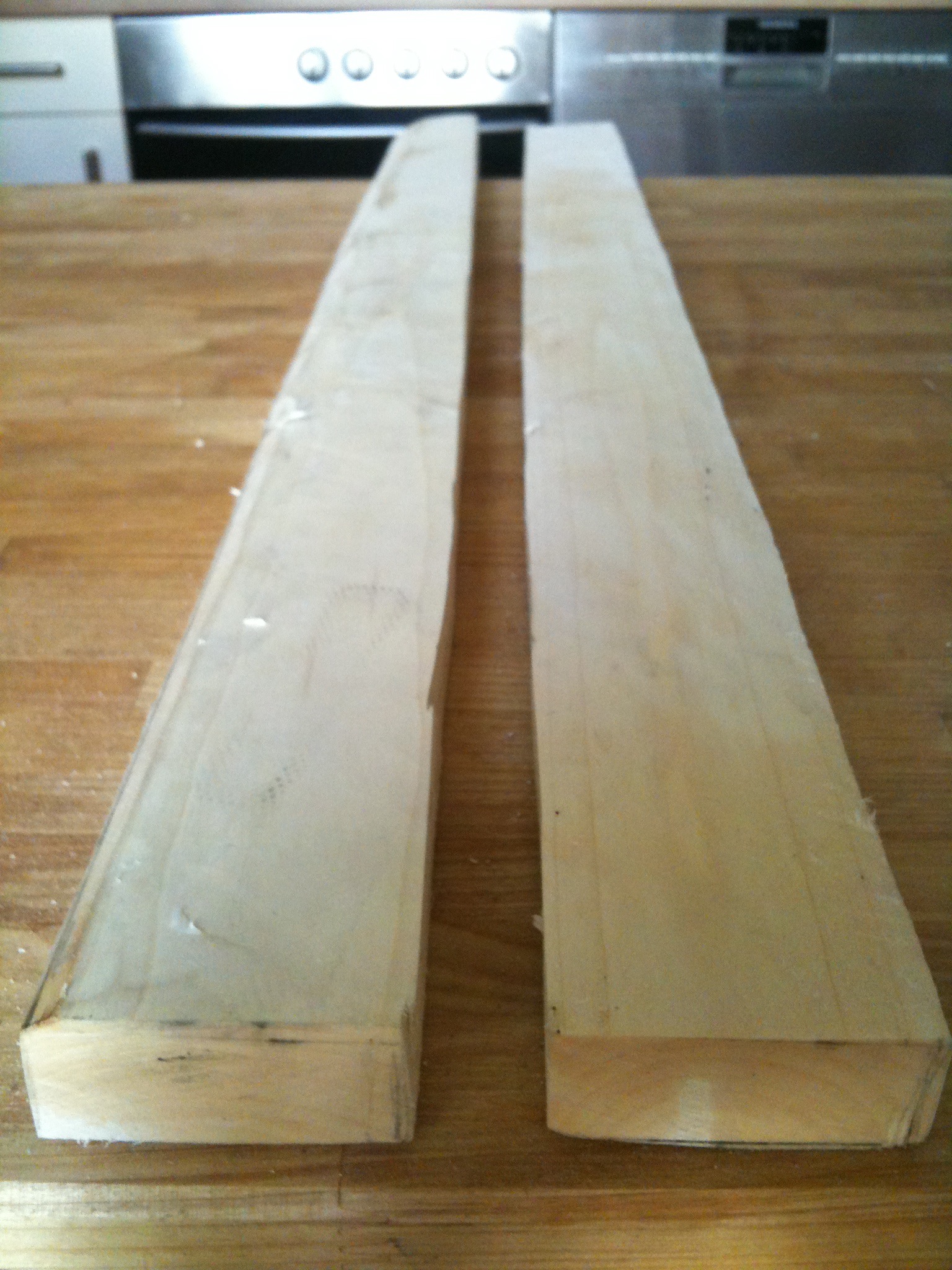 Die Latten haben jetzt ca. 5 cm x ca. 2 cm x70cm. Jetzt noch ein wenig schnitzen/hobeln bis 4,5cm x 1,5cm x 70cm.
