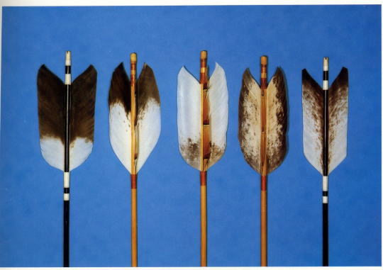 Zu Makiwarapfeilen mit Federn sei gesagt, dass ein Satz Makiwarapfeile für die Makiwara-Zeremonie aus zwei befiederten Pfeilen besteht, die von der Qualität her nichts mit den "normalen" Makiwarapfeilen zu tun haben. Sie sind befiedert, meist mit weißen Federn, und haben Nocken und Spitzen aus Horn oder Elfenbein. Es werden immer die ungeschnittenen äußeren Schwingenfedern verwendet. Warum? Keine Ahnung. So ein Pfeil kann leicht mehr als hundert Euronen kosten.