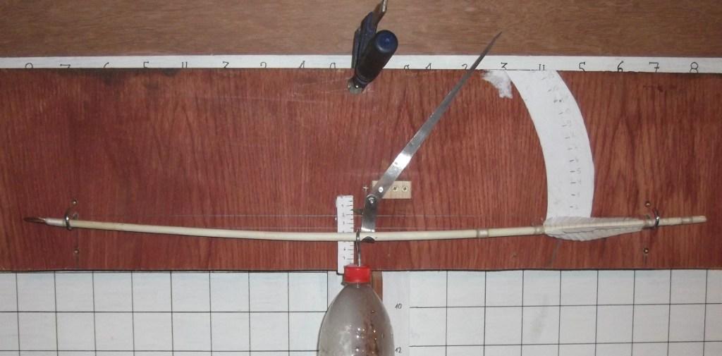 Ist natürlich noch nicht perfekt, es fehlen da noch eine etwas genauere Skala beim Zeiger, ein entspr. Gegengewicht für selbigen, ein Zeiger und eine Skala für die grobe Messung an der Pfeilauflage und ein zweites Gelenk an selbiger, aber es reicht schon mal, um den Spine so auf grob 3-5# bestimmen zu können...