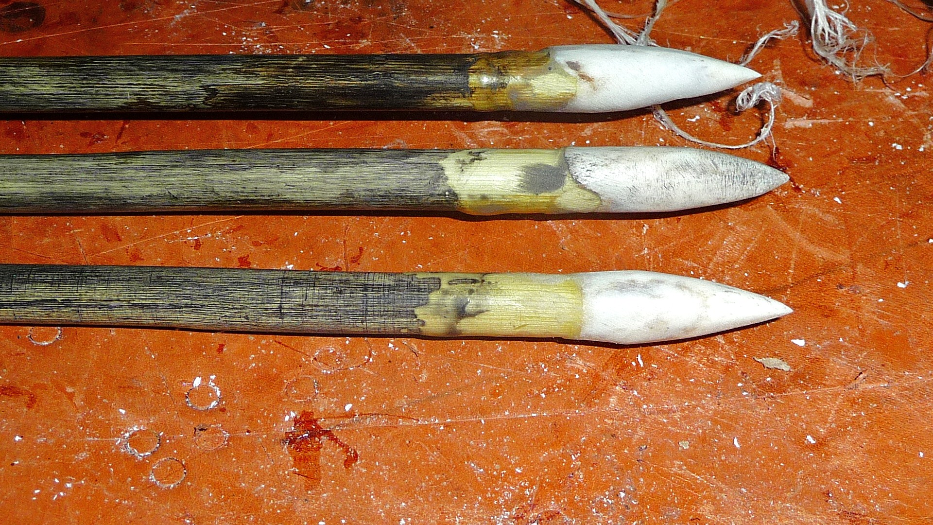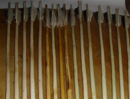 Die Schäfte wurden gestern noch mit den Spitzen und Federn versehen. Für die Federn hab ich modernen Pattex genommen, für die Hornspitze Birkenpech (Hab ich iwann mal gemacht und gammelte bis jetzt unbenutzt in der Garage...)