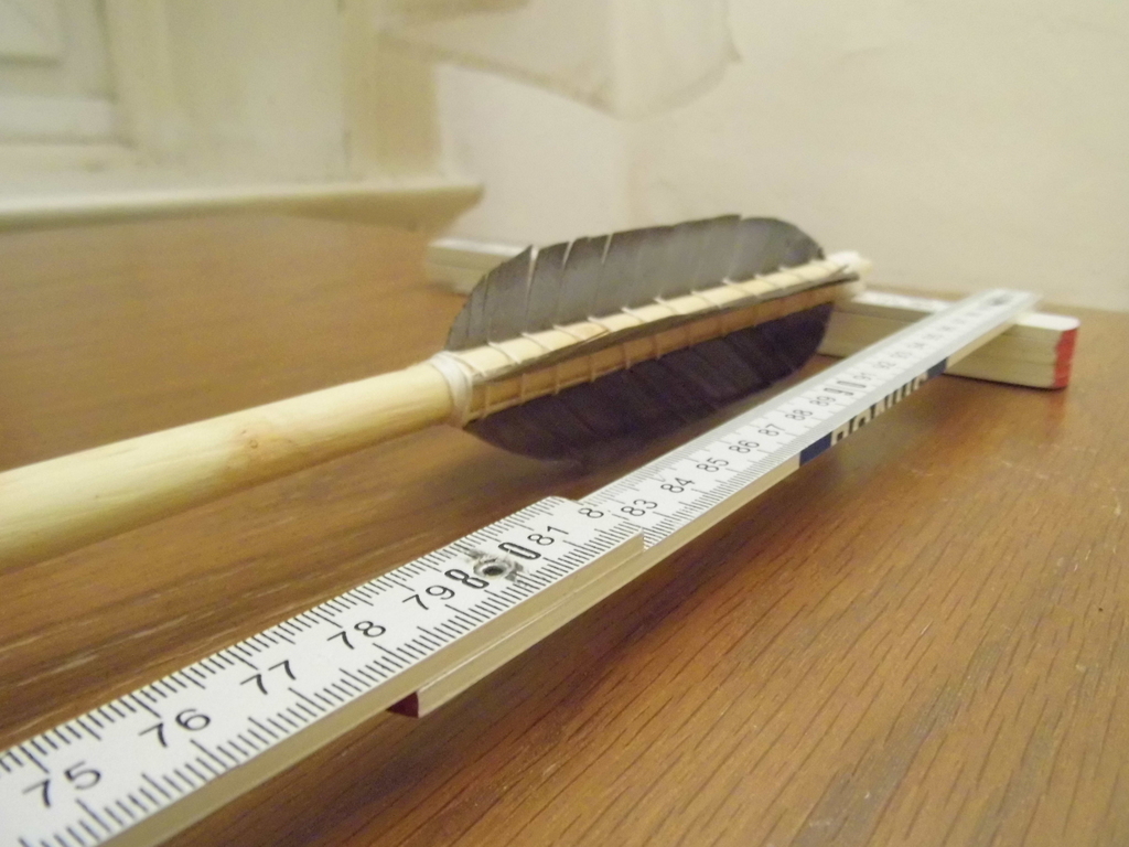Ich entschied mich dann heute spontan auf 3 für eine ägyptische Form, naja zumindest behauptet n Toter Buchauthor, dass die wohl was mit Ägypten zu tun hätte ... is ja auch egal. Dabei wird der Schaft in drei Drittel aufgeteilt. Von der Spitze bis zum Ende des Segments verbreitert sich der Durchmesser gleichmäßig. Das zweite Drittel hat den maximalen Durchmesser, und bis zur Nocke verringert sich der Durchmesser wieder, ist aber bis, kurz vor der Nocke, noch etwas stärker abgehobelt, und erreicht vor der Nocke seinen dünnsten Punkt. So habe ich 12g gut gemacht. Da das natürlich totaler Frevel ist, hab ich direkt erstmal ne Needlebodkin Tüllenspitze von ner vergangenen Wichtelaktion mit Endfest aufgebabscht. Die wiegt 11,1g und macht mit dem Barreltaper richtig schönen FOC. Nach arabischer konvention ist diese Spitze eigentlich zu leicht. Sie beträgt nur ~1/6 der Gesammtpfeilmasse. Um das Verhältniss nicht zu zerstören, müssten nun die Federn 1/6el des Spitzengewichts wiegen, was auch bloß bummelige 1,8g wären. Daher entschied ich mich für viel, und groß! Daraus wurde eine 15mm hohe, 15cm lange 4fach Befiederung. Das passte Gewichtstechnisch ganz gut! :) Die Leitpaddel (Befiederung ist echt kleiner in meiner Welt) habe ich dann vorne und hinten abgerundet, wie es bei persischen Pfeilen gewünscht gewesen sein soll - weiß der Geier was da dran ist. Ich hatte noch LW Graugans von Quercus rumfliegen, falls es wen interessiert ;). Nun noch die Nocke, ein Kreuznockschlitz kam mir gelegen. Erstmal kann ich so zwei unterschiedliche Sehendurchmesser nutzen, dann ists bei Schösslingen ja eh bums, wierum die liegen, solang der Spine passt (was er eh nicht tut :D), und so kann ich ihn von meinen beiden Bögen schießen - was maximalen Nutzen erlaubt.