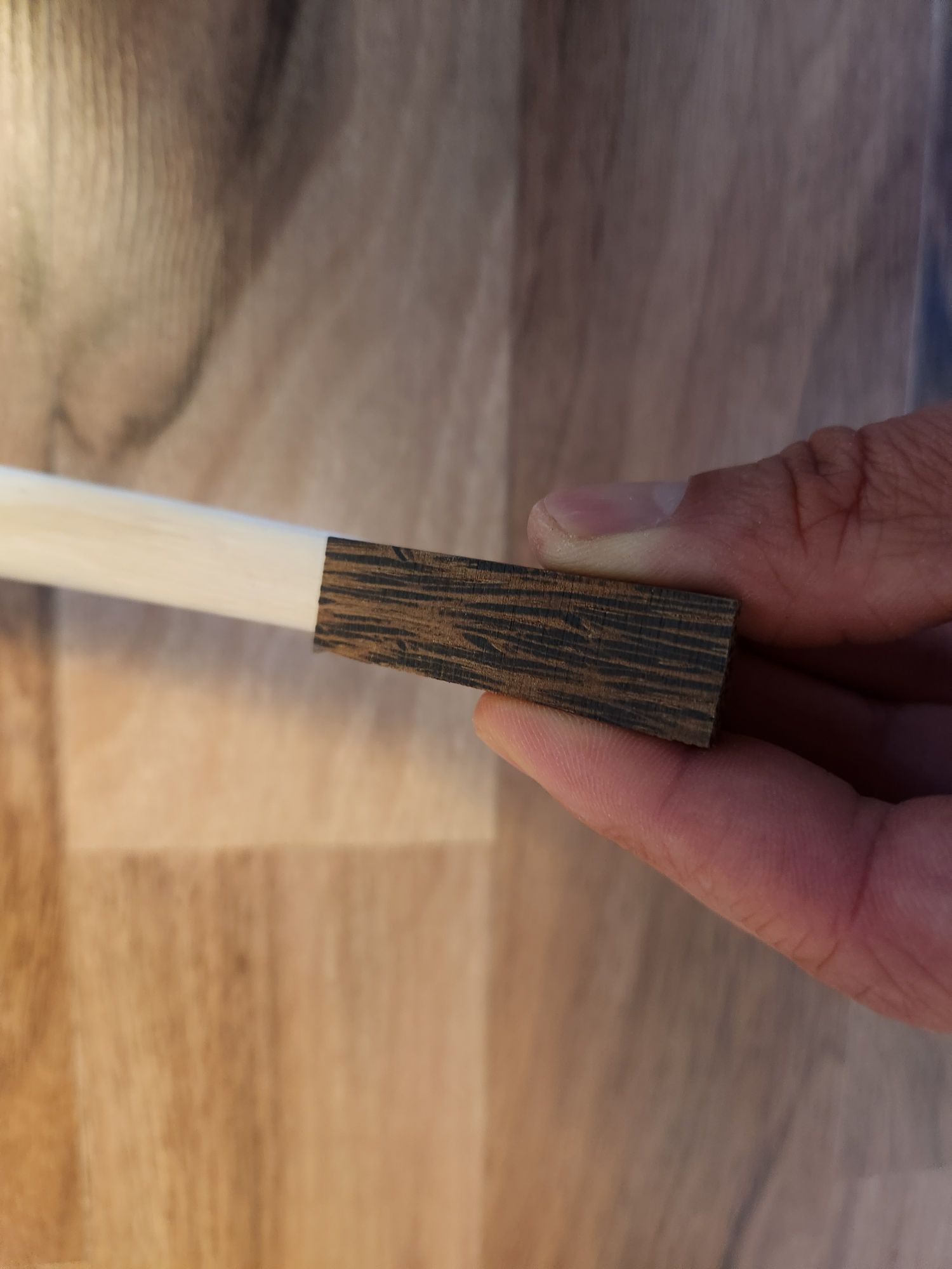 Ich bin jetzt zurück ausm Urlaub und hab mich gleich wieder dran gemacht. Für die Nocken hab ich mir noch was besonderes ausgedacht. Ich werde sie von oben und an den Seiten mit Palmholz einkleiden. Auf das Hornoverlay kommt noch eines aus Palmholz drauf, dann Feil ich an den Seiten noch einiges an Material weg sodass die Rundungen die ich am Rücken gemacht hatte wegfallen und klebe da ebenfalls Plättchen aus Palmholz. Ich halte Palmholz eigentlich für ungeeignet als Material für die Overlays weshalb ich dann die Kerbe einfach bis aufs Horn runterfeilen werde