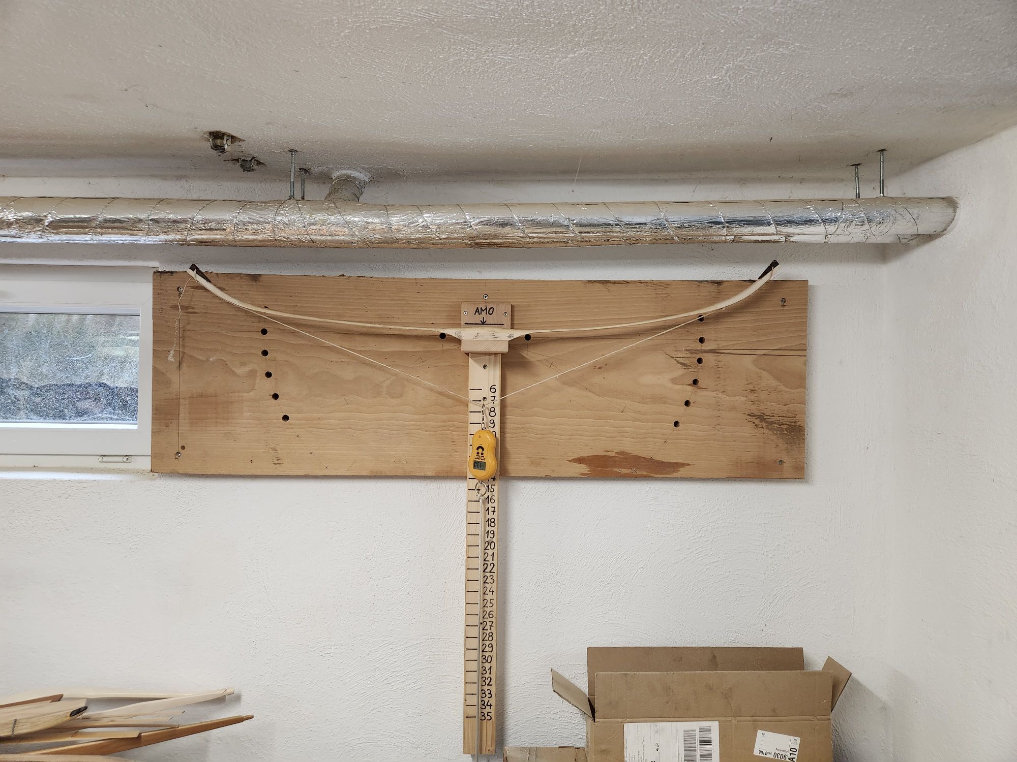 Heute hab ich mal ein wenig mit dem Tillern begonnen. Zuerst wurde der Bauch abgeflacht, dann hab ich mal den Tiller kontrolliert. Der linke Wurfarm sah ganz gut aus, rechts war nach dem Fadeout eine Schwachstelle. Jetzt hab ich mal beide Wurfarme angeglichen und in Wurfarmmitte mehr Biegung eingebracht. Momentan biegt noch immer hauptsächlich im inneren drittel, deshalb werde ich die Wurfarmmitte weiter schwächen.