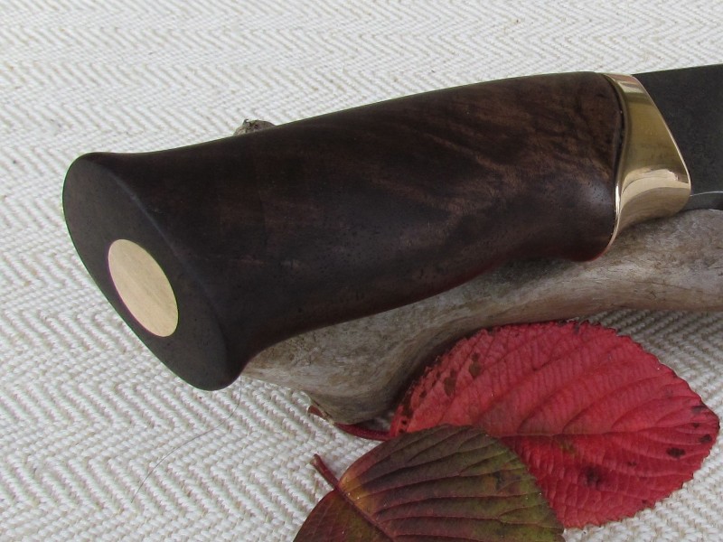 Die Klingenform finde ich sehr elegant und ansprechend, der Griff ist ergonomisch - ich mag die Verdickung zum Griffende, gibt der Hand guten Halt. Das Nussbaumholz ist ein ausgesucht schönes Stück und auch die Messerscheide ist top. Passende Farbe, klasse Leder, versenkte Naht.