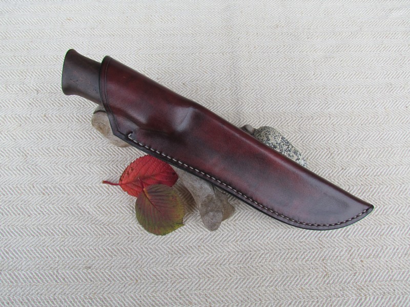 Die Klingenform finde ich sehr elegant und ansprechend, der Griff ist ergonomisch - ich mag die Verdickung zum Griffende, gibt der Hand guten Halt. Das Nussbaumholz ist ein ausgesucht schönes Stück und auch die Messerscheide ist top. Passende Farbe, klasse Leder, versenkte Naht.