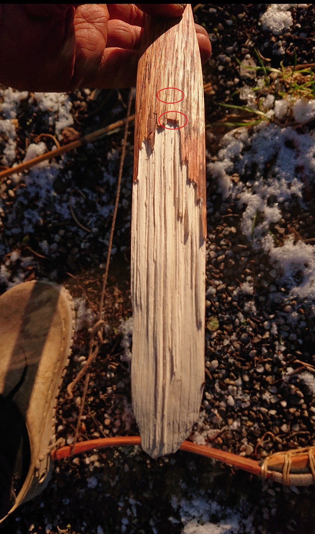 Beim Bruch macht es den Eindruck als wäre er vom Rücken zum Bauch entlang der Fasern gebrochen, tu mir bei den Fotos schwer weil direkt von oben. Kann es sein das du hier auslaufende Maserung hattest?