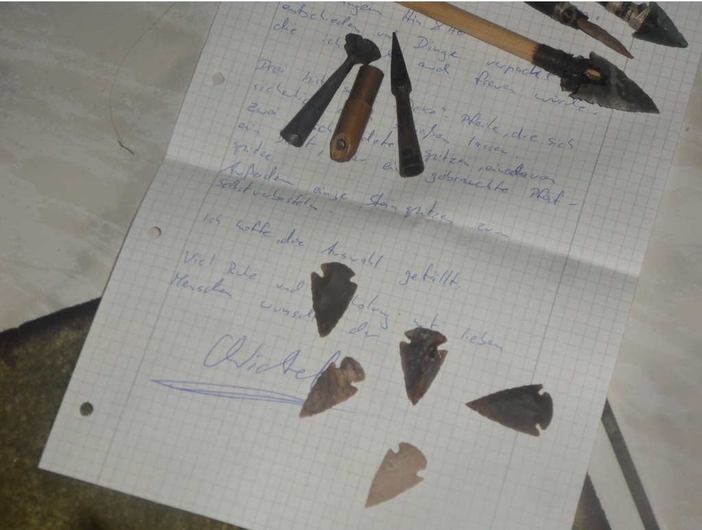 Die Steinspitzen standen nämlich auf unserer Einkaufsliste, nachdem wir nun vom Pfeilsapling infiziert sind! Und so werden sie gerade schon verarbeitet!