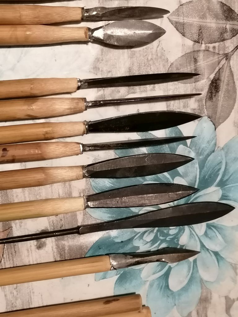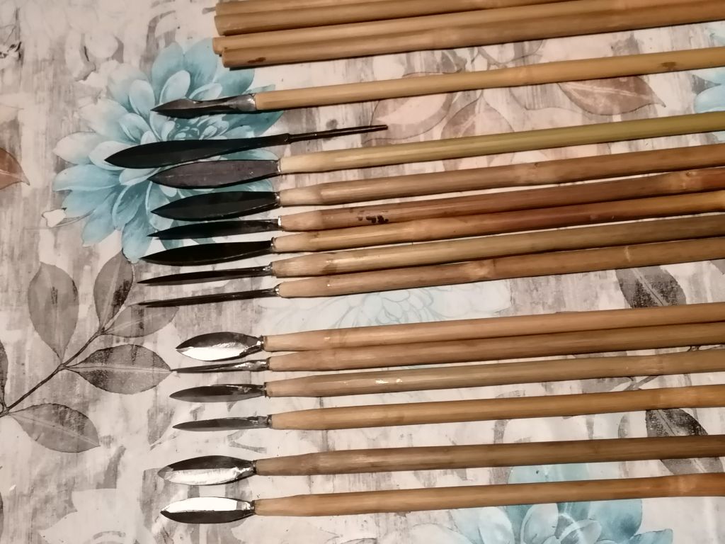 Ich habe die kleinen Spitzen von gestern heute geschliffen und bin nun mit der Form und Gewicht zufrieden. Sie haben alle 14g und ergeben mit den Bambusschäften ca. 56g … das 9,5gpp. Mal sehen vielleicht nehme ich den Spitzen noch etwas Gewicht.