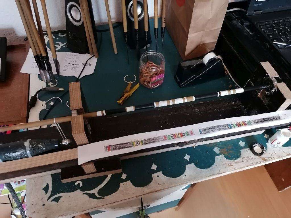 So ich habe 2 Sätze Pfeile fertig stellen können. Dem dritte Satz fehlen noch die Spitzen und Federn, lackiert ist er schon. Ich habe mir ein Cresting Gerät gebaut um etwas schneller zu werden, leider sind Naturschäfte nicht zu 100% rund und machen das Ganze etwas ungenauer. Für die großen Flächen war es aber eine schnelle Hilfe. Für die dünnen Linien habe ich die Schäfte auf dem Gerät von Hand gedreht, so hatte ich mehr Kontrolle. Nach 8h Pfeile malen war mein Hirn zu nichts mehr fähig ;D