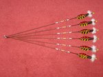 Schäfte: Gold Tip Traditionell 600, mit 70 grain Spitze und 4" Saubuckelbefiederung und Tacer aus Kaninchenfell selbst gefärbt.(würde ich nicht mehr machen - sowas gibt es im Anglerbedarf recht günstig super gefärbt zu kaufen) Länge 75,5 cm.