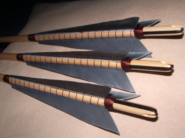 Die Pfeile sind alle 29" lang und mit Graugansfedern befiedert (scheiß Arbeit aus 40 Federn dann die Befeiderung rauszuschneiden und zu schleifen... ach naja aber es hat doch einigermaßen Spaß gemacht