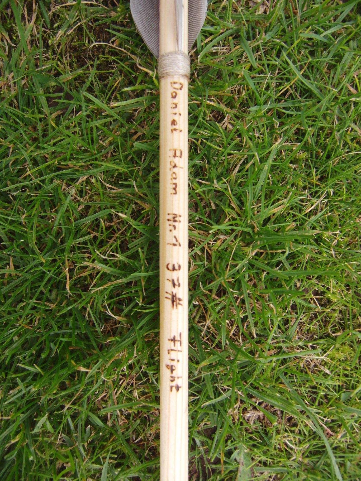 Geklebt mit Sekundenkleber, gewickelt mit feinerem Leinengarn, dann noch Name, Nummer und Spinewert drauf und gefinished mit Leinölfirnis. (auch zwischen den Federn)