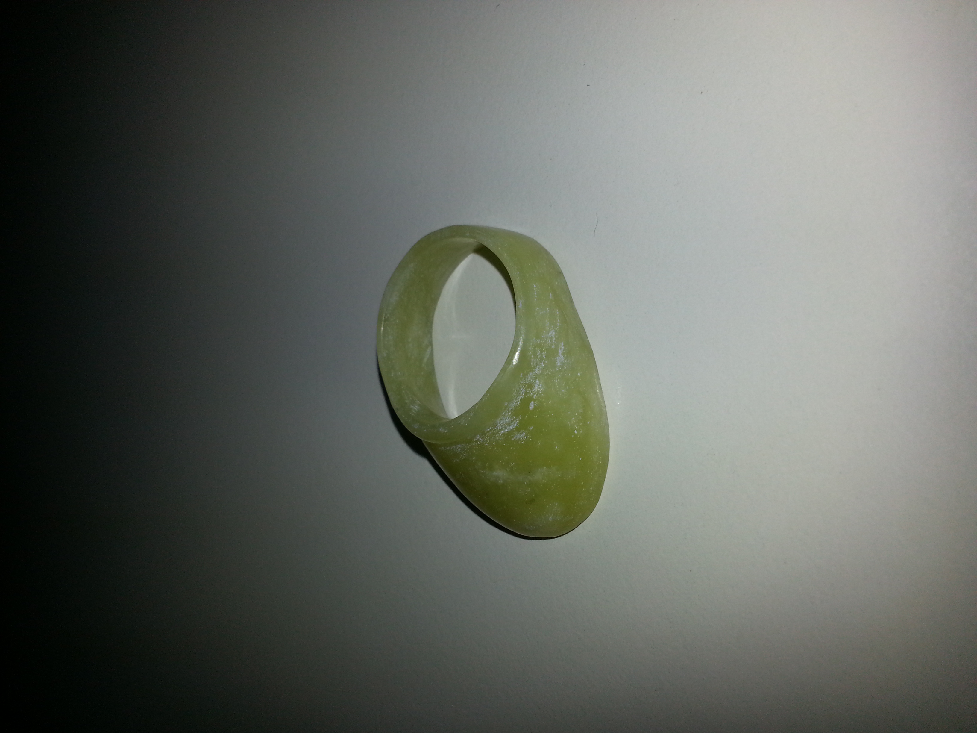 War zum Schluss ein bisschen Locker, wäre aber meiner Meinung nach gut zu benutzen gewesen (Hatte trotzdem eine sehr angenehme Passform). Die Wandung am Ring war sehr filigran ca 1,5mm (kein Wunder denkt ihr euch jetzt bestimmt...jaja so lernt man eben dazu. Vor der Endausarbeitung also wie im oberen Bild hatte der Ring eine 2,5mm starke Wandung und war meines erachtens stark genug, wenn man bedenkt das Nephrit eine Mohs-Härte von 6-6,5 hat. Ich hätte diese Grobe Form behalten sollen welche sowiso besser zu meiner Statur passt