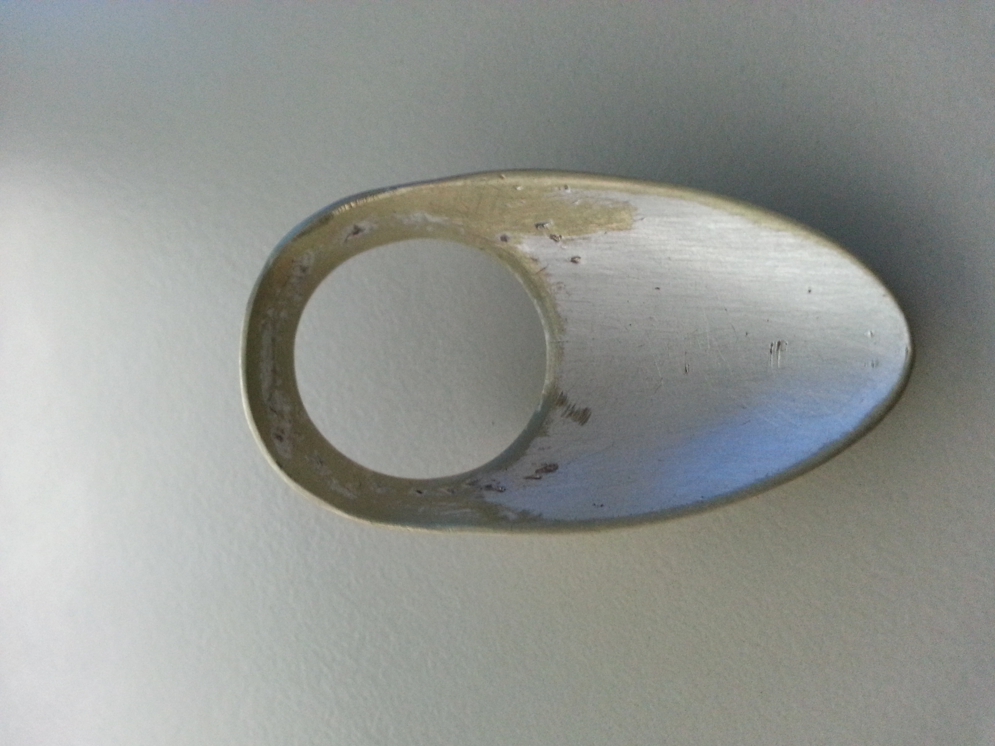 , die die geeigent wären sind entweder zu teuer oder schwer zu bearbeiten. Die günstigeren wie z.B. Aragonit (Onyx) splittert schon fast beim annähern der Dremel- Trennscheibe. Meine erste Wahl, das von meinen Vorfahren verwendete Nephrit zu nehmen war wahrscheinlich die richtige Entscheidung. Auf der Suche nach geeigneten objekten die sich vielleicht zu einem Daumenring umbauen lassen habe ich gestern auf dem Flohmarkt einen kleinen Löffel für 1 Euro gekauft (keine Ahnung aus welchem Metall der ist, wahrscheinlich "Neusilber" also irgendeine Kupfer-Nickel-Zink-Legierung mit Festigkeit und Aussehen von Silber). Für einen Euro kann ich das mal zum Experimentieren benutzen dachte ich mir nach den frustrierenden Ergebnissen mit meinen Mineralien-Experiment. Hier das Ergebnis: